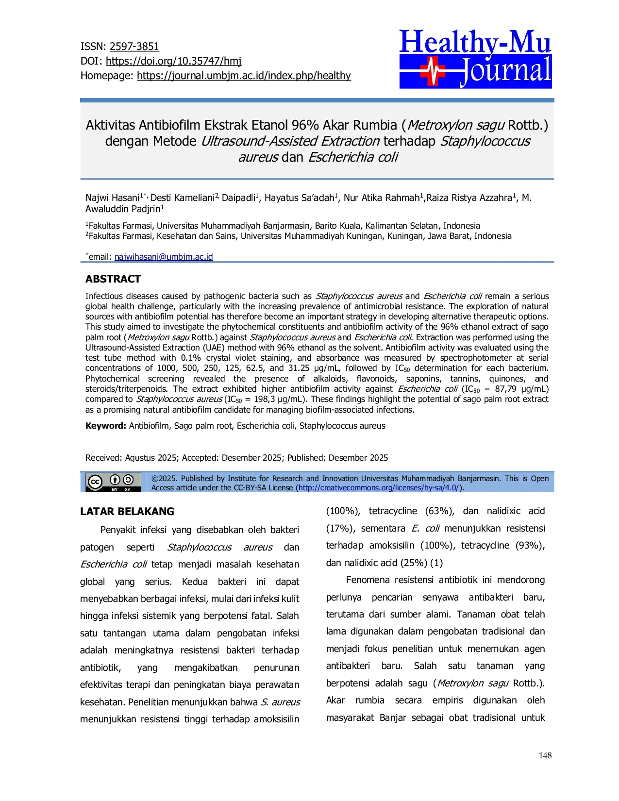 Healthy-Mu JournalHealthy-Mu JournalPenyakit infeksi yang disebabkan oleh bakteri patogen seperti Staphylococcus aureus dan Escherichia coli tetap menjadi masalah kesehatan global yang serius, terutama dengan meningkatnya prevalensi resistensi antimikroba. Eksplorasi sumber alami dengan potensi antibiofilm menjadi strategi penting dalam mengembangkan alternatif terapeutik. Penelitian ini bertujuan untuk menginvestigasi kandungan fitokimia dan aktivitas antibiofilm dari ekstrak etanol 96% akar rumbia (Metroxylon sagu Rottb.) terhadap Staphylococcus aureus dan Escherichia coli. Ekstraksi dilakukan menggunakan metode Ultrasound-Assisted Extraction (UAE) dengan etanol 96% sebagai pelarut. Aktivitas antibiofilm dievaluasi menggunakan metode tabung uji dengan pewarnaan kristal violet 0,1%, dan absorbansi diukur dengan spektrofotometer pada konsentrasi serial 1000, 500, 250, 125, 62,5, dan 31,25 µg/mL, diikuti dengan penentuan IC50 untuk setiap bakteri. Skrining fitokimia mengungkapkan adanya alkaloid, flavonoid, saponin, tanin, kuinon, dan steroid/triterpenoid. Ekstrak menunjukkan aktivitas antibiofilm yang lebih tinggi terhadap Escherichia coli (IC50 = 87,79 µg/mL) dibandingkan Staphylococcus aureus (IC50 = 198,3 µg/mL). Temuan ini menyoroti potensi ekstrak akar rumbia sebagai kandidat antibiofilm alami yang menjanjikan untuk mengatasi infeksi terkait biofilm.