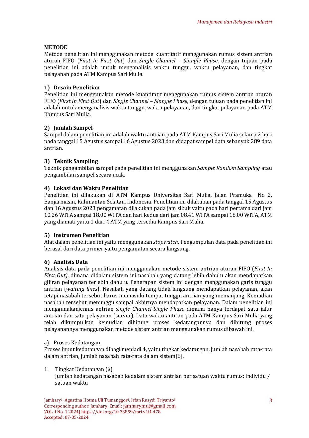 Manajemen dan Rekayasa IndustriManajemen dan Rekayasa IndustriLatar Belakang: Antrian yang lama di ATM membuat nasabah rugi karena banyak waktu yang terbuang dalam proses menunggu. Dalam jangka panjang, reputasi perusahaan terganggu, dan jumlah nasabah menurun karena performa pelayanannya menurun dan kurang bisa diandalkan bagi para nasabah. Tujuan: Menganalisis waktu tunggu, tingkat pelayanan, waktu proses pada ATM Kampus Sari Mulia. Metode: Analisis antrian pada ATM Kampus Sari Mulia menggunakan metode Sistem Antrian dengan aturan First In First Out (FIFO) Single Server-Single Phase. Hasil: Probabilitas pelayanan dalam keadaan kosong (P0) yaitu 0,55 atau 55%. Probabilitas pelayanan tidak menganggur (Pn) yaitu 0,09 atau 9%. Jumlah rata-rata nasabah dalam antrian Lq yaitu 0,39 orang. Jumlah rata-rata nasabah dalam sistem Ls yaitu 0,85 orang. Rata-rata waktu nasabah dalam antrian (Wq) yaitu 0,02 jam atau 1,2 menit/orang. Rata-rata waktu nasabah dalam sistem (Ws) yaitu 0,05 jam atau 3 menit/orang. Rata-rata waktu proses nasabah adalah (t) yaitu 0,3 atau 1,8 menit/orang. Simpulan: Waktu tunggu pada ATM Kampus Sari Mulia adalah 1,2 menit, tingkat pelayanan pada ATM Kampus Sari Mulia adalah 37 orang/jam, waktu proses pada ATM kampus Sari Mulia adalah 1,8 Menit.