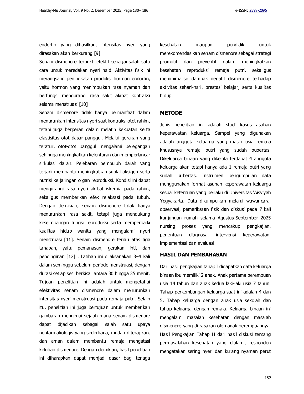 Healthy-Mu JournalHealthy-Mu JournalDismenore, atau nyeri menstruasi, sering mengganggu aktivitas sehari-hari di kalangan remaja putri. Intervensi non-farmakologis seperti olahraga dianggap sebagai alternatif yang efektif. Penelitian ini menguji efektivitas latihan dismenore dalam mengurangi nyeri menstruasi pada remaja. Latihan dismenore meningkatkan pengetahuan, keterampilan, dan manajemen diri remaja terhadap nyeri menstruasi. Latihan dismenore secara efektif mengurangi nyeri menstruasi, meningkatkan suasana hati, mengurangi stres, dan meningkatkan kualitas hidup, terutama dengan dukungan keluarga. Kesederhanaan dan keamanannya menjadikannya strategi non-farmakologis yang direkomendasikan untuk mengelola dismenore.
