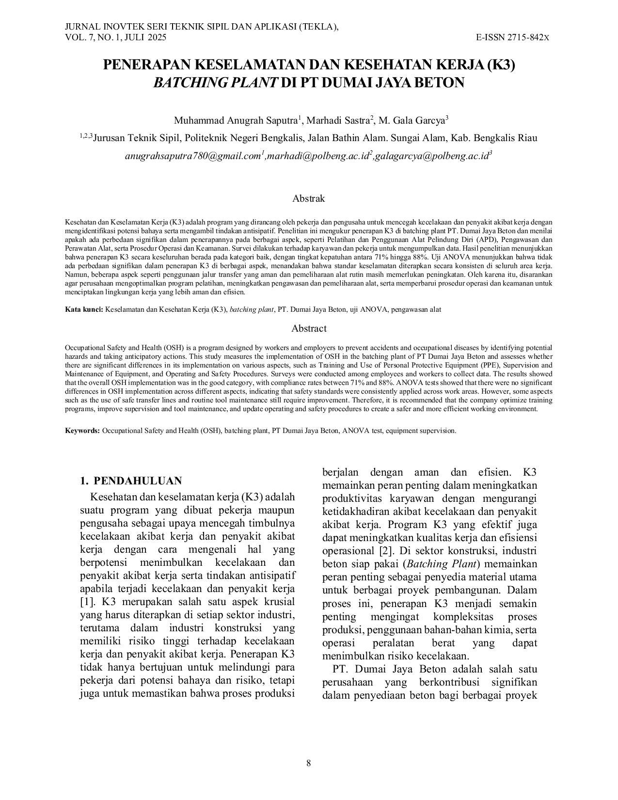 Jurnal TeKLAJurnal TeKLAKesehatan dan Keselamatan Kerja (K3) adalah program yang dirancang oleh pekerja dan pengusaha untuk mencegah kecelakaan dan penyakit akibat kerja dengan mengidentifikasi potensi bahaya serta mengambil tindakan antisipatif. Penelitian ini mengukur penerapan K3 di batching plant PT. Dumai Jaya Beton dan menilai apakah ada perbedaan signifikan dalam penerapannya pada berbagai aspek, seperti Pelatihan dan Penggunaan Alat Pelindung Diri (APD), Pengawasan dan Perawatan Alat, serta Prosedur Operasi dan Keamanan. Survei dilakukan terhadap karyawan dan pekerja untuk mengumpulkan data. Hasil penelitian menunjukkan bahwa penerapan K3 secara keseluruhan berada pada kategori baik, dengan tingkat kepatuhan antara 71% hingga 88%. Uji ANOVA menunjukkan bahwa tidak ada perbedaan signifikan dalam penerapan K3 di berbagai aspek, menandakan bahwa standar keselamatan diterapkan secara konsisten di seluruh area kerja. Namun, beberapa aspek seperti penggunaan jalur transfer yang aman dan pemeliharaan alat rutin masih memerlukan peningkatan. Oleh karena itu, disarankan agar perusahaan mengoptimalkan program pelatihan, meningkatkan pengawasan dan pemeliharaan alat, serta memperbarui prosedur operasi dan keamanan untuk menciptakan lingkungan kerja yang lebih aman dan efisien.