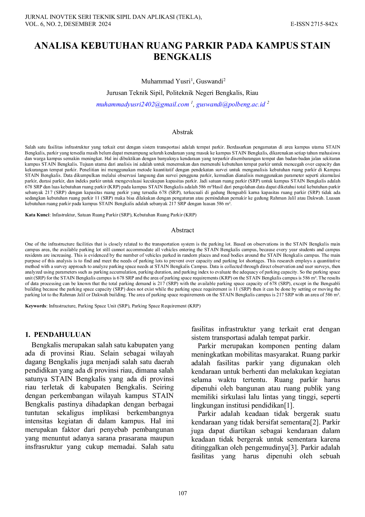 Jurnal TeKLAJurnal TeKLASalah satu fasilitas infrastruktur yang terkait erat dengan sistem transportasi adalah tempat parkir. Berdasarkan pengamatan di area kampus utama STAIN Bengkalis, parkir yang tersedia masih belum dapat menampung seluruh kendaraan yang masuk ke kampus STAIN Bengkalis, dikarenakan setiap tahun mahasiswa dan warga kampus semakin meningkat. Hal ini dibuktikan dengan banyaknya kendaraan yang terparkir disembarangan tempat dan badan-badan jalan sekitaran kampus STAIN Bengkalis. Tujuan utama dari analisis ini adalah untuk menemukan dan memenuhi kebutuhan tempat parkir untuk mencegah over capacity dan kekurangan tempat parkir. Penelitian ini menggunakan metode kuantitatif dengan pendekatan survei untuk menganalisis kebutuhan ruang parkir di Kampus STAIN Bengkalis. Data dikumpulkan melalui observasi langsung dan survei pengguna parkir, kemudian dianalisis menggunakan parameter seperti akumulasi parkir, durasi parkir, dan indeks parkir untuk mengevaluasi kecukupan kapasitas parkir. Jadi satuan ruang parkir (SRP) untuk kampus STAIN Bengkalis adalah 678 SRP dan luas kebutuhan ruang parkir (KRP) pada kampus STAIN Bengkalis adalah 586 m². Hasil dari pengolahan data dapat diketahui total kebutuhan parkir sebanyak 217 (SRP) dengan kapasitas ruang parkir yang tersedia 678 (SRP), terkecuali di gedung Bengsabli karna kapasitas ruang parkir (SRP) tidak ada sedangkan kebutuhan ruang parkir 11 (SRP) maka bisa dilakukan dengan pengaturan atau pemindahan pemakir ke gedung Rahman Jalil atau Dakwah. Luasan kebutuhan ruang parkir pada kampus STAIN Bengkalis adalah sebanyak 217 SRP dengan luasan 586 m².