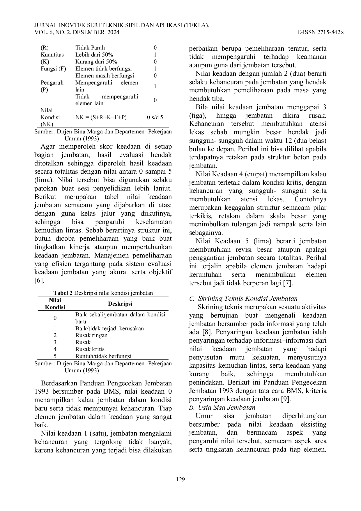 Jurnal TeKLAJurnal TeKLAJembatan memainkan peran penting dalam sistem jaringan jalur karena dampak signifikan jika rusak. Jembatan juga vital dalam infrastruktur, mendukung ekonomi, sosial, dan budaya untuk mencapai pembangunan yang seimbang. Namun, jembatan berisiko jika tidak dirancang sesuai kelas jalurnya, yang dapat memengaruhi keselamatan lalu lintas. Pemantauan kondisi jembatan dilakukan dengan Bridge Management System (BMS), yang dirancang untuk mengendalikan, melaksanakan, dan memantau jembatan. Pengecekan dilakukan secara cermat, mengevaluasi setiap elemen yang rusak untuk mendapatkan nilai kondisi. Dalam penelitian ini, evaluasi dilakukan pada Jembatan Bengkalis. Hasil penelitian menunjukkan nilai kondisi (NK) jembatan adalah 3, memerlukan perhatian segera karena kemungkinan menjadi serius dalam 12 bulan ke depan. Diharapkan hasil kajian ini dapat memberikan pedoman untuk meningkatkan keahlian dan kinerja Jembatan Bengkalis.