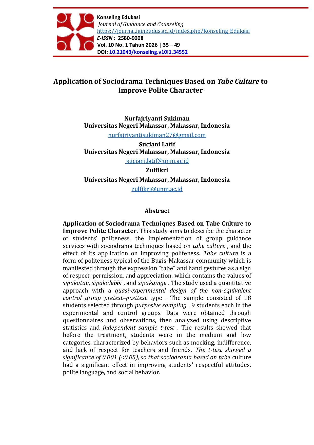 Konseling Edukasi : Journal of Guidance and CounselingKonseling Edukasi : Journal of Guidance and CounselingPenelitian ini bertujuan untuk mendeskripsikan karakter sopan santun siswa, pelaksanaan layanan bimbingan kelompok dengan teknik sociodrama berbasis budaya tabe, serta efek penerapannya dalam meningkatkan sopan santun. Budaya tabe adalah bentuk sopan santun khas masyarakat Bugis-Makassar yang diwujudkan melalui ungkapan tabe dan gestur tangan sebagai tanda hormat, izin, dan apresiasi, yang mengandung nilai-nilai sipakatau, sipakalebbi, dan sipakainge. Penelitian menggunakan pendekatan kuantitatif dengan desain quasi-eksperimen non-ekivalen kelompok kontrol pretest-posttest. Sampel terdiri dari 18 siswa yang dipilih melalui sampling purposive, yaitu 9 siswa masing-masing pada kelompok eksperimen dan kontrol. Data diperoleh melalui kuesioner dan observasi, kemudian dianalisis menggunakan statistik deskriptif dan uji t sampel independen. Hasil menunjukkan bahwa sebelum perlakuan, siswa berada pada kategori sedang dan rendah, ditandai dengan perilaku seperti mengejek, acuh tak acuh, dan kurangnya rasa hormat terhadap guru dan teman. Uji t menunjukkan signifikansi sebesar 0,001 (<0,05), sehingga sociodrama berbasis budaya tabe memiliki efek signifikan dalam meningkatkan sikap hormat, bahasa sopan, dan perilaku sosial siswa.