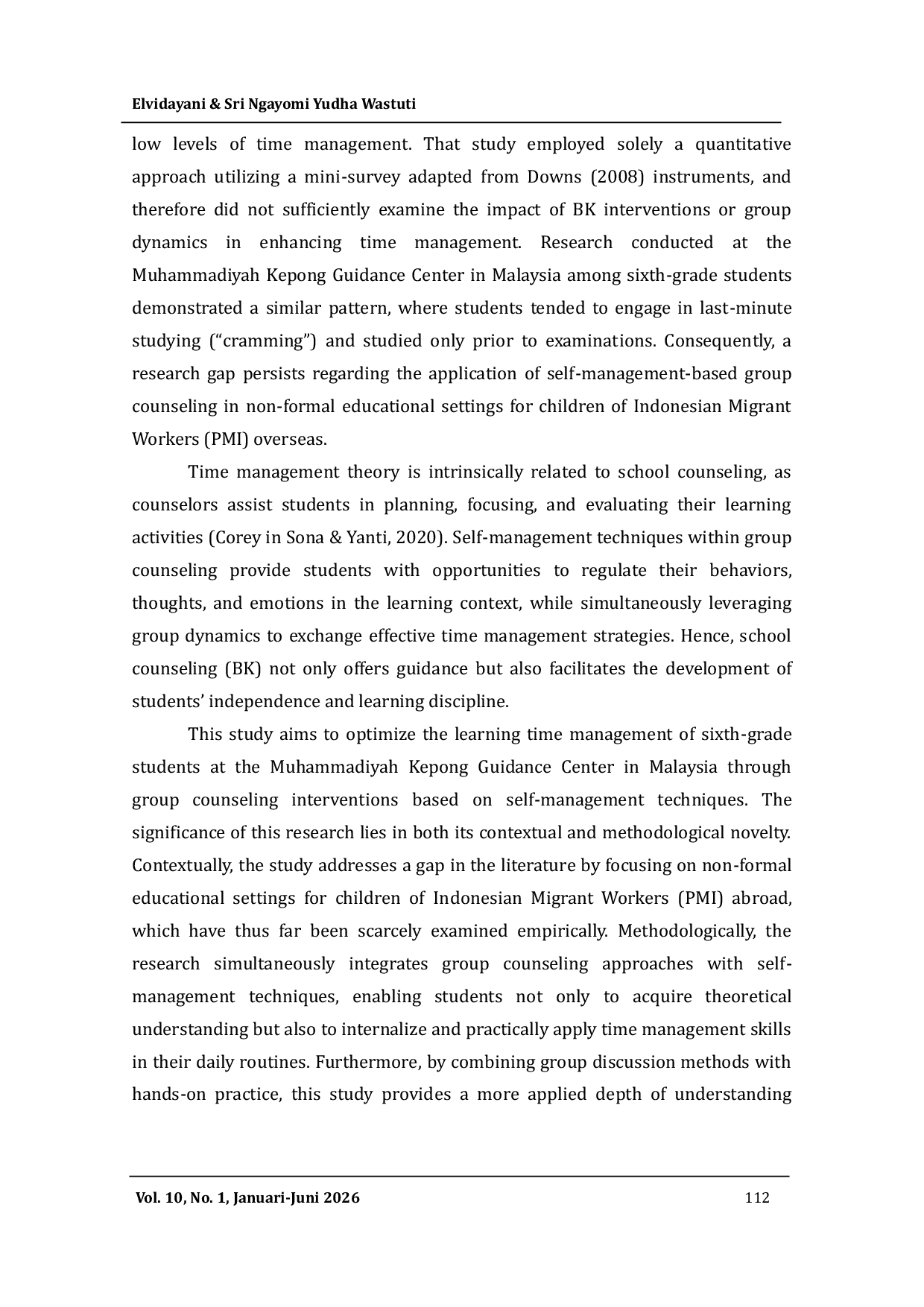 Layanan bimbingan kelompok dengan teknik self-management terbukti efektif dalam meningkatkan kemampuan manajemen waktu belajar siswa kelas 6 di Sanggar Bimbingan Kepong Malaysia.Hal ini ditunjukkan oleh peningkatan rata-rata skor dari pre-test ke post-test, serta respons positif siswa terhadap penerapan self-management dalam perencanaan, prioritas tugas, pengendalian diri, dan pemantauan aktivitas belajar.Bimbingan dan konseling (BK) memainkan peran penting dalam menumbuhkan kemandirian dan pengaturan diri siswa melalui praktik self-management, sekaligus memperkuat teori manajemen waktu Downs (2008) dan konsep self-management Corey (dalam Sona & Yanti, 2020) dalam konteks pendidikan non-formal.Guru BK dapat memanfaatkan bimbingan kelompok dengan strategi self-management sebagai cara untuk meningkatkan disiplin belajar, manajemen tugas, dan efektivitas belajar secara keseluruhan siswa.