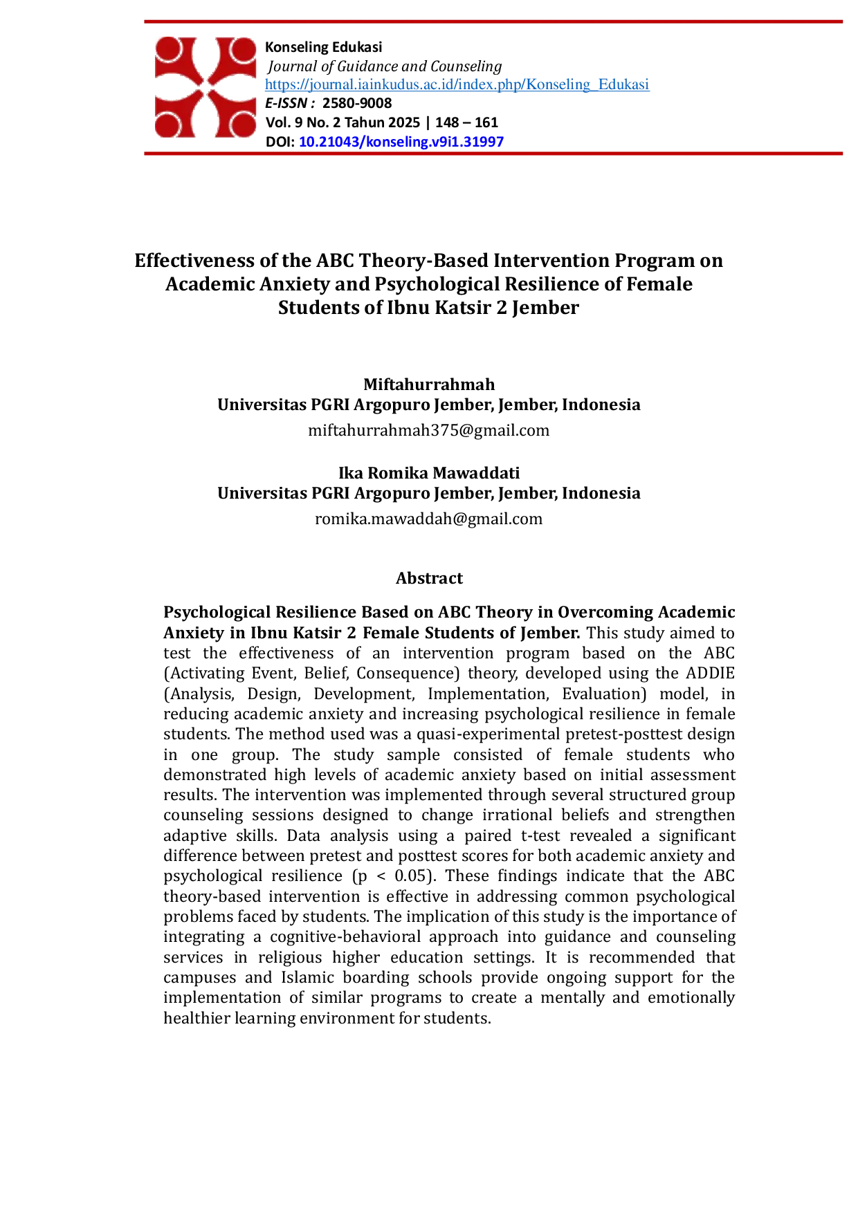 Konseling Edukasi : Journal of Guidance and CounselingKonseling Edukasi : Journal of Guidance and CounselingKetangguhan psikologis berdasarkan teori ABC dalam mengatasi kecemasan akademik pada siswa perempuan Ibnu Katsir 2 Jember. Penelitian ini bertujuan untuk menguji efektivitas program intervensi yang didasarkan pada teori ABC (Aktivasi Acara, Keyakinan, Konsekuensi), yang dikembangkan menggunakan model ADDIE (Analisis, Desain, Pengembangan, Implementasi, Evaluasi), dalam mengurangi kecemasan akademik dan meningkatkan ketangguhan psikologis pada siswa perempuan. Metode yang digunakan adalah desain quasi-eksperimen pretest-posttest pada satu kelompok. Sampel penelitian terdiri dari siswa perempuan yang menunjukkan tingkat kecemasan akademik tinggi berdasarkan hasil penilaian awal. Intervensi diterapkan melalui beberapa sesi konseling kelompok terstruktur yang dirancang untuk mengubah keyakinan irasional dan memperkuat keterampilan adaptif. Analisis data menggunakan uji t berpasangan menunjukkan perbedaan yang signifikan antara skor pretest dan posttest untuk kedua kecemasan akademik dan ketangguhan psikologis (p < 0,05). Temuan ini menunjukkan bahwa intervensi berbasis teori ABC efektif dalam mengatasi masalah psikologis yang umum dihadapi oleh siswa. Implikasi penelitian ini adalah pentingnya mengintegrasikan pendekatan kognitif-perilaku ke dalam layanan bimbingan dan konseling di lingkungan pendidikan tinggi agama. Disarankan agar kampus dan pondok pesantren memberikan dukungan berkelanjutan untuk implementasi program serupa untuk menciptakan lingkungan belajar yang lebih sehat secara mental dan emosional bagi siswa.