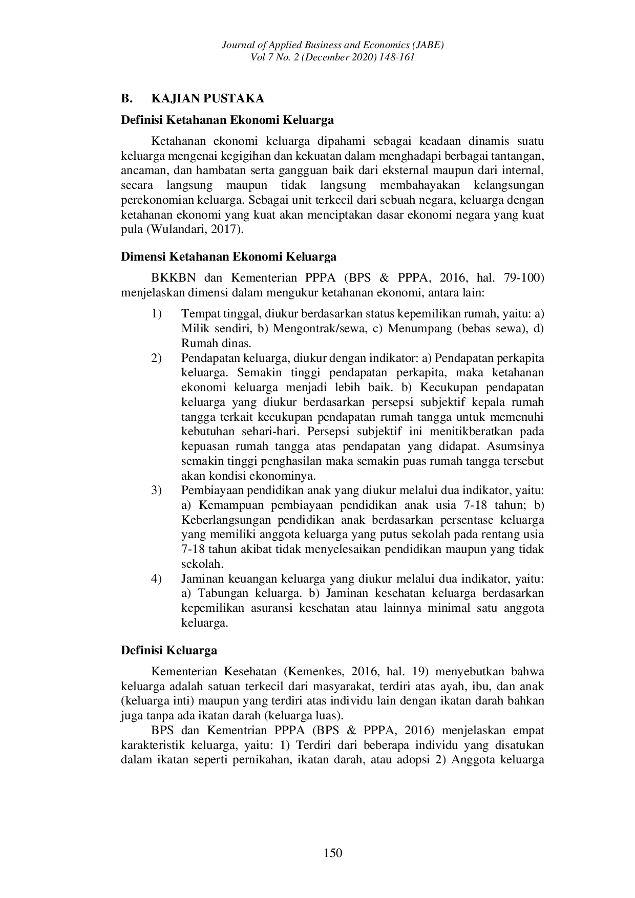 Berdasarkan indikator kepemilikan tempat tinggal, pendapatan keluarga, pembiayaan pendidikan anak, dan jaminan keuangan keluarga didapati bahwa ketahanan ekonomi keluarga di Depok dimasa pandemi COVID-19 mengalami penurunan dari sisi pendapatan dan kemampuan memenuhi kebutuhan keluarga.Dimana sebelum pandemi sebanyak 74% keluarga mampu memenuhi kebutuhan, tapi saat pandemi berkurang 18% menjadi 56%.Namun dari aspek kepemilikan tempat tinggal, pembiayaan pendidikan anak, dan jaminan keuangan keluarga, ketahanan ekonomi keluarga di Depok dapat dinilai cukup baik.Rekomendasi dari penelitian ini adalah diperlukan strategi untuk mempertahankan ketahanan ekonomi keluarga berupa pengelolaan keuangan keluarga, dan perlu dilakukan penelitian pengukuran ketahanan finansial keluarga dalam menghadapi goncangan ekonomi seperti adanya wabah COVID-19 ini.