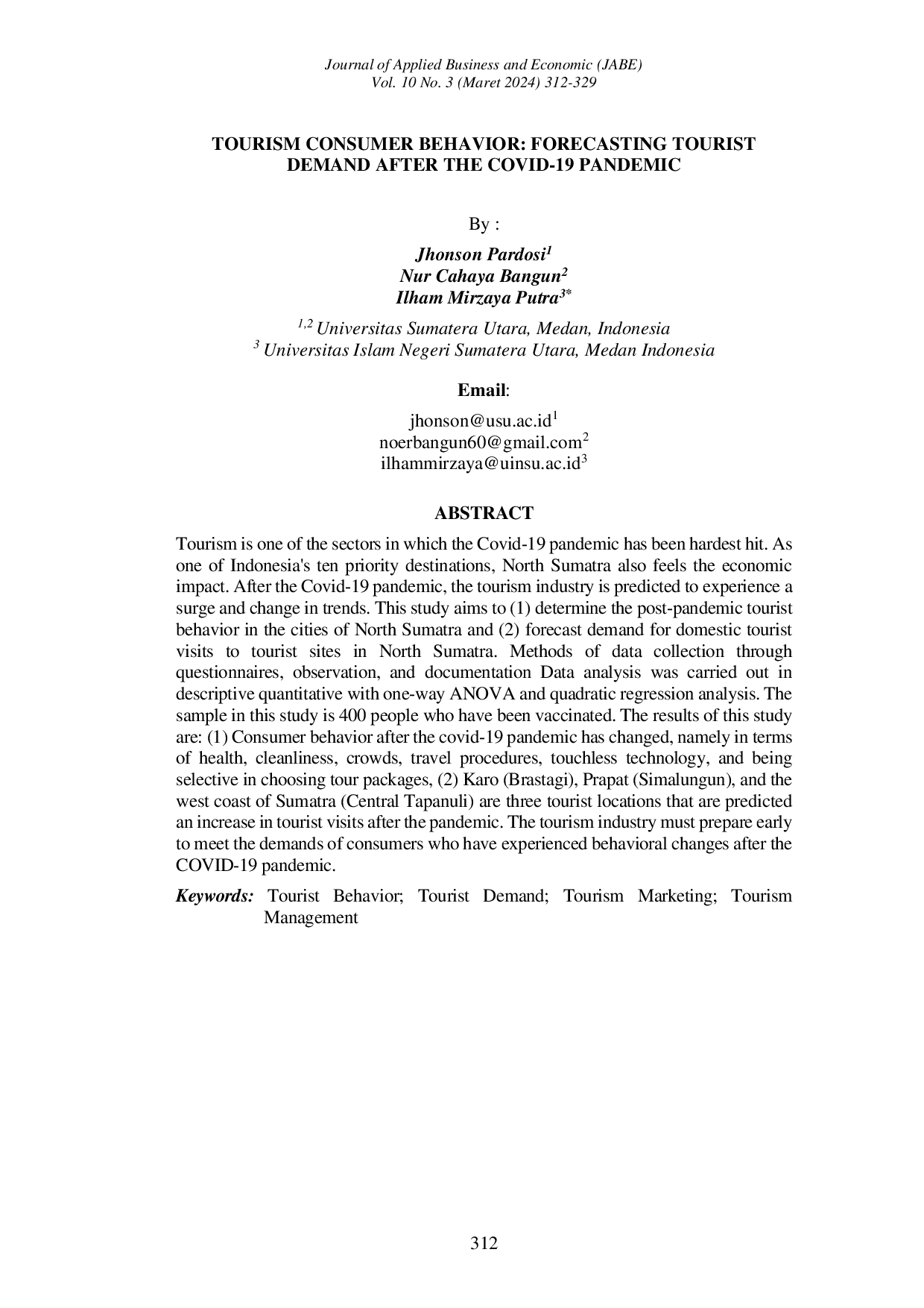 JABE (Journal of Applied Business and Economic)JABE (Journal of Applied Business and Economic)Tourism is one of the sectors hardest hit by the Covid-19 pandemic. As one of Indonesias ten priority destinations, North Sumatra also feels the economic impact. After the Covid-19 pandemic, the tourism industry is predicted to experience a surge and change in trends. This study aims to (1) determine the post-pandemic tourist behavior in the cities of North Sumatra and (2) forecast demand for domestic tourist visits to tourist sites in North Sumatra. Methods of data collection through questionnaires, observation, and documentation. Data analysis was carried out descriptively quantitatively with one-way ANOVA and quadratic regression analysis. The sample in this study is 400 people who have been vaccinated. The results of this study are: (1) Consumer behavior after the covid-19 pandemic has changed, namely in terms of health, cleanliness, crowds, travel procedures, touchless technology, and being selective in choosing tour packages, (2) Karo (Brastagi), Prapat (Simalungun), and the west coast of Sumatra (Central Tapanuli) are three tourist locations that are predicted to experience an increase in tourist visits after the pandemic. The tourism industry must prepare early to meet the demands of consumers who have experienced behavioral changes after the COVID-19 pandemic.