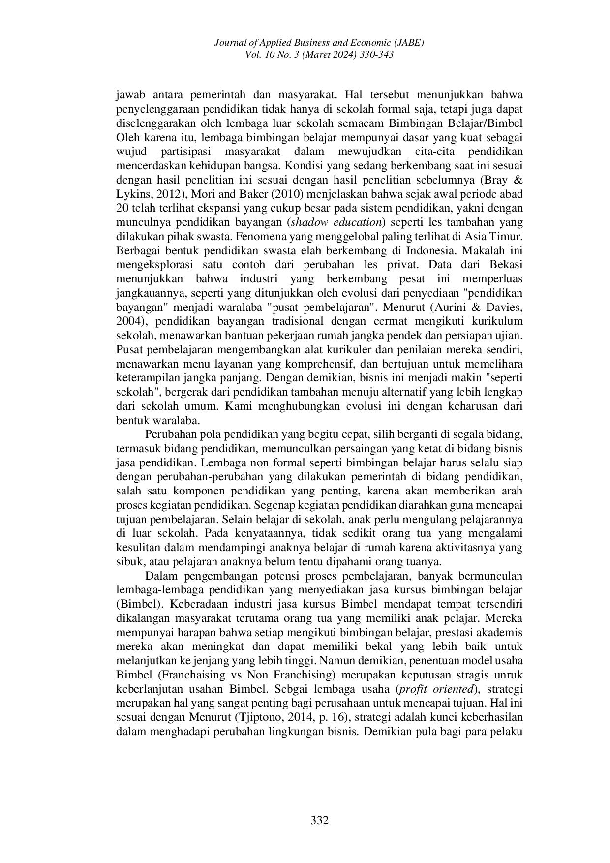 JABE (Journal of Applied Business and Economic)JABE (Journal of Applied Business and Economic)Penelitian ini bertujuan untuk mengetahui model lembaga Bimbingan Belajar (Bimbel) yang layak di Bekasi, Jawa Barat. Penelitian ini membandingkan kelebihan dan kekurangan waralaba yang merupakan salah satu model bisnis yang paling dikenal daripada Non-Waralaba (usaha mandiri). Metode yang digunakan adalah deskriptif kualitatif untuk menjawab permasalahan yang ditemukan peneliti dan melakukan analisis terhadap fenomena yang terjadi di lembaga bimbingan belajar dengan analisis SWOT untuk mengkaji kekuatan dan peluang kemudian dimanfaatkan semaksimal mungkin untuk mengurangi kelemahan dan ancaman. Setelah dilakukan analisis SWOT dan perumusan strategi baru, ternyata Bimbel masih mendapatkan kendala strategi dari berbagai sektor. Lebih jauh lagi, Bimbel membutuhkan strategi bisnis yang dijalankan dengan baik dalam memilih Franchising daripada Non-Franchising (usaha mandiri). Penelitian ini menggali data dengan menggunakan 6 Bimbel yang terdiri dari 3 Waralaba dan 3 Bimbel lainnya Non Waralaba yang kesemuanya dioperasikan di Bekasi.