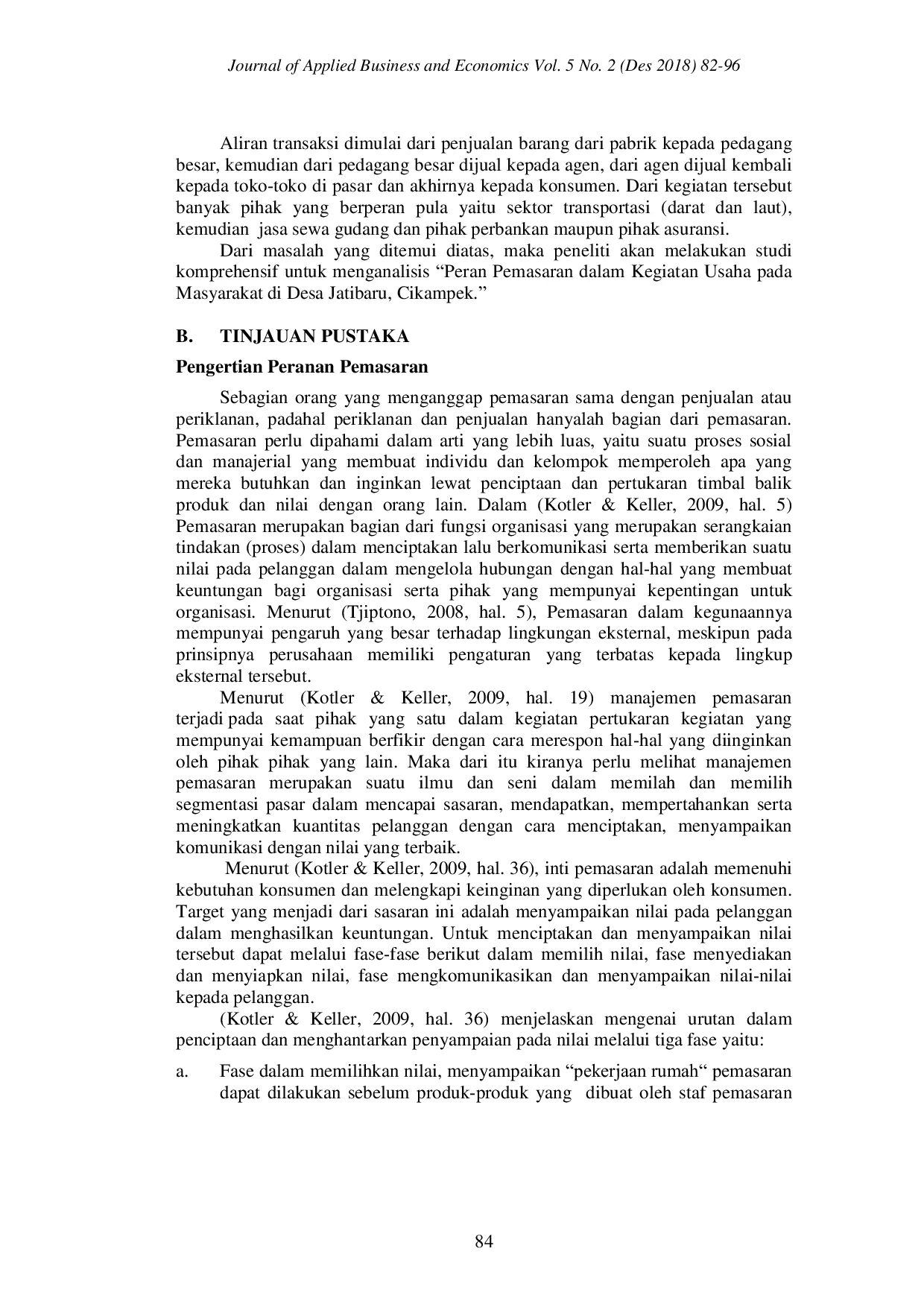 Penelitian ini menyimpulkan bahwa pemasaran memiliki peran penting dalam kegiatan usaha di Desa Jatibaru, Cikampek, yang dipengaruhi oleh bauran pemasaran.Agar usaha dapat berkembang, penting untuk memperhatikan produk yang sesuai kebutuhan, berkualitas, menarik, ramah lingkungan, dan mudah diingat.harga yang sesuai kualitas, terjangkau, dan kompetitif.serta promosi yang melibatkan berbagai cara, termasuk peran pemerintah dan pemanfaatan teknologi seperti e-commerce untuk memperluas jangkauan pasar.