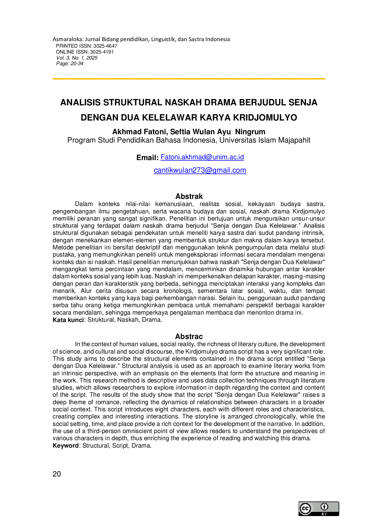 ASMARALOKA: Jurnal Bidang Pendidikan, Linguistik, dan Sastra IndonesiaASMARALOKA: Jurnal Bidang Pendidikan, Linguistik, dan Sastra IndonesiaDalam konteks nilai-nilai kemanusiaan, realitas sosial, kekayaan budaya sastra, pengembangan ilmu pengetahuan, serta wacana budaya dan sosial, naskah drama Kirdjomulyo memiliki peranan yang sangat signifikan. Penelitian ini bertujuan untuk menguraikan unsur-unsur struktural yang terdapat dalam naskah drama berjudul Senja dengan Dua Kelelawar. Analisis struktural digunakan sebagai pendekatan untuk meneliti karya sastra dari sudut pandang intrinsik, dengan menekankan elemen-elemen yang membentuk struktur dan makna dalam karya tersebut. Metode penelitian ini bersifat deskriptif dan menggunakan teknik pengumpulan data melalui studi pustaka, yang memungkinkan peneliti untuk mengeksplorasi informasi secara mendalam mengenai konteks dan isi naskah. Hasil penelitian menunjukkan bahwa naskah Senja dengan Dua Kelelawar mengangkat tema percintaan yang mendalam, mencerminkan dinamika hubungan antar karakter dalam konteks sosial yang lebih luas. Naskah ini memperkenalkan delapan karakter, masing-masing dengan peran dan karakteristik yang berbeda, sehingga menciptakan interaksi yang kompleks dan menarik. Alur cerita disusun secara kronologis, sementara latar sosial, waktu, dan tempat memberikan konteks yang kaya bagi perkembangan narasi. Selain itu, penggunaan sudut pandang serba tahu orang ketiga memungkinkan pembaca untuk memahami perspektif berbagai karakter secara mendalam, sehingga memperkaya pengalaman membaca dan menonton drama ini.