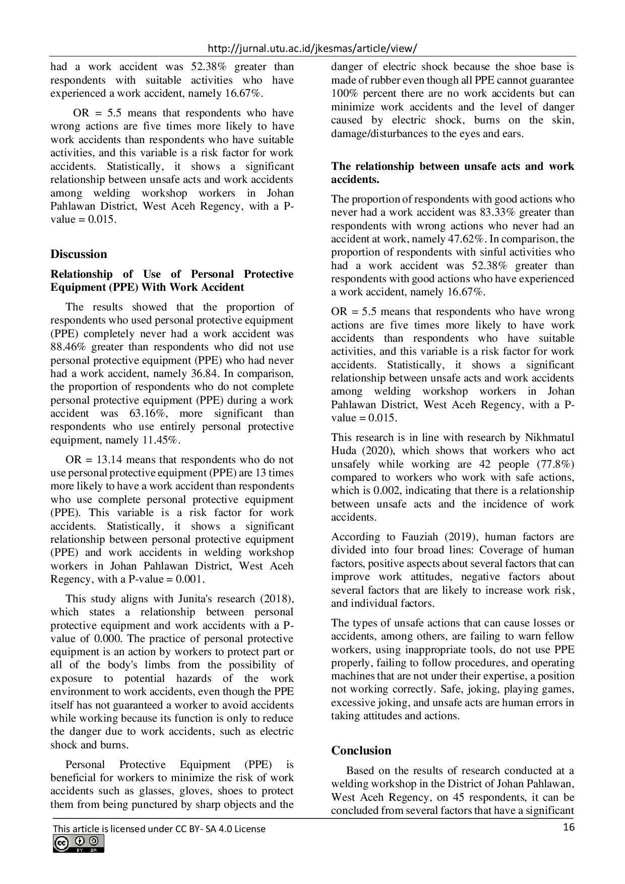 J-Kesmas: Jurnal Fakultas Kesehatan Masyarakat (The Indonesian Journal of Public Health)J-Kesmas: Jurnal Fakultas Kesehatan Masyarakat (The Indonesian Journal of Public Health)A work accident is an unexpected event that can cause harm to the work process, resulting in human and property casualties. Prevention must be carried out by reducing hazard factors, considering unsafe actions, unsafe conditions, and safety management systems, as well as the workers mental and physical condition. This descriptive-analytic study with a cross-sectional design involved 45 respondents, utilizing total population sampling. Logistic regression analysis using Stata 14 revealed a significant relationship between the use of PPE (P-value: 0.001, OR: 14.14, CI: 2.86–60.21) and unsafe acts (P-value: 0.015, OR: 5.5, CI: 1.39–21.71) with work accidents. The study suggests that workshop owners provide protective equipment to workers to enhance comfort, safety, and reduce hazards, and implement methods to increase worker confidence and focus during welding.