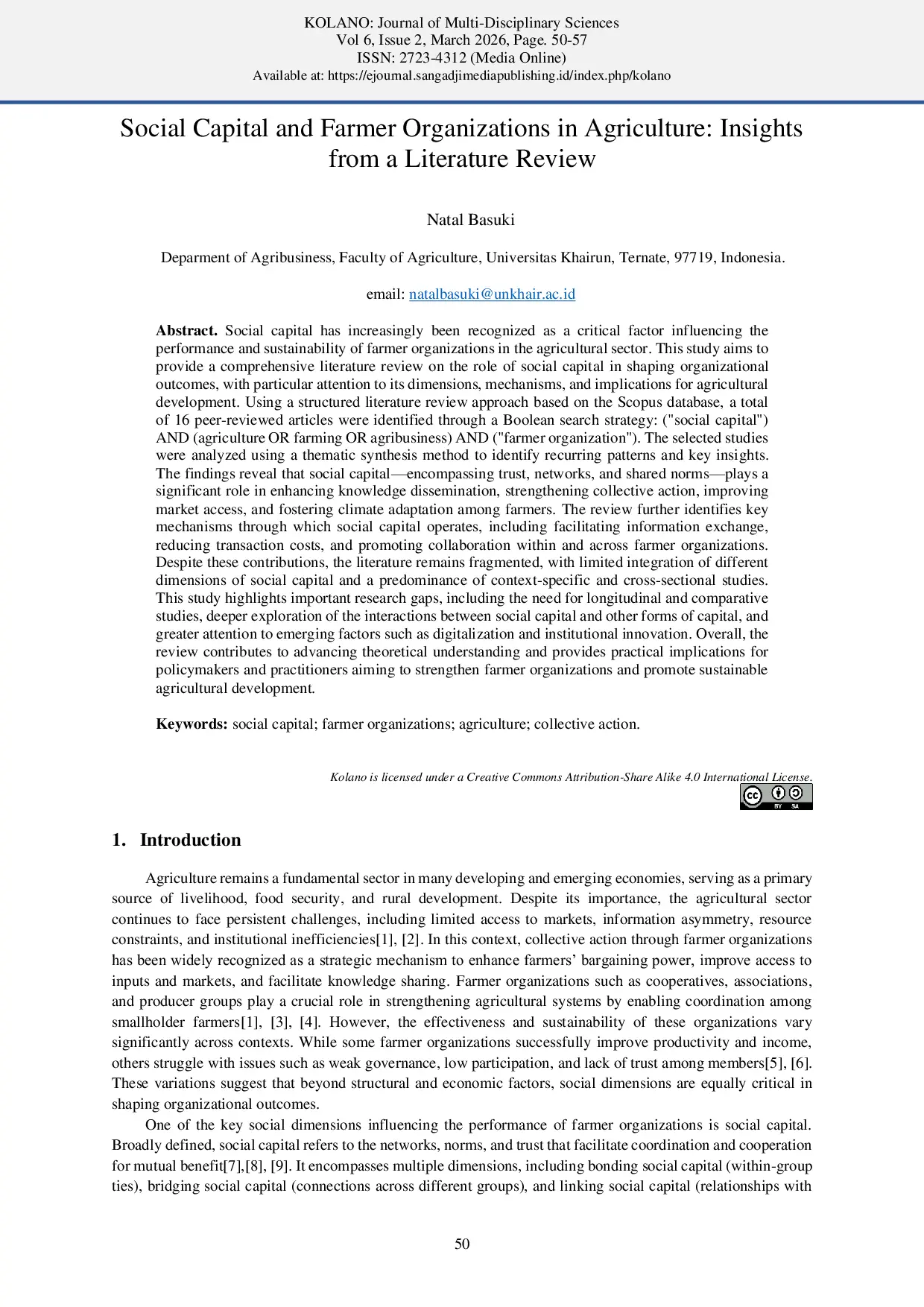 KOLANO: Journal of Multi-Disciplinary SciencesKOLANO: Journal of Multi-Disciplinary SciencesModal sosial semakin diakui sebagai faktor kritis yang memengaruhi kinerja dan keberlanjutan organisasi petani di sektor pertanian. Studi ini bertujuan untuk memberikan tinjauan literatur komprehensif mengenai peran modal sosial dalam membentuk hasil organisasi, dengan perhatian khusus pada dimensi, mekanisme, dan implikasinya terhadap pembangunan pertanian. Menggunakan pendekatan tinjauan literatur terstruktur berdasarkan database Scopus, total 16 artikel peer-reviewed diidentifikasi melalui strategi pencarian Boolean: (social capital) AND (agriculture OR farming OR agribusiness) AND (farmer organization). Studi yang dipilih dianalisis menggunakan metode sintesis tematik untuk mengidentifikasi pola berulang dan wawasan utama. Temuan menunjukkan bahwa modal sosial—yang mencakup kepercayaan, jaringan, dan norma bersama—memainkan peran penting dalam meningkatkan penyebaran pengetahuan, memperkuat aksi kolektif, memperbaiki akses pasar, dan mendorong adaptasi terhadap perubahan iklim di kalangan petani. Tinjauan ini juga mengidentifikasi mekanisme utama bagaimana modal sosial beroperasi, termasuk memfasilitasi pertukaran informasi, mengurangi biaya transaksi, serta mendorong kolaborasi dalam dan antar organisasi petani. Meskipun demikian, literatur masih terfragmentasi, dengan integrasi terbatas antar dimensi modal sosial dan didominasi oleh studi kontekstual spesifik serta bersifat cross-sectional. Studi ini menyoroti kesenjangan penelitian penting, termasuk kebutuhan akan studi longitudinal dan komparatif, eksplorasi lebih dalam terhadap interaksi antara modal sosial dan bentuk modal lainnya, serta perhatian lebih besar terhadap faktor-faktor baru seperti digitalisasi dan inovasi institusional. Secara keseluruhan, tinjauan ini turut memajukan pemahaman teoretis dan memberikan implikasi praktis bagi pembuat kebijakan dan praktisi yang bertujuan memperkuat organisasi petani serta mendorong pembangunan pertanian berkelanjutan.
