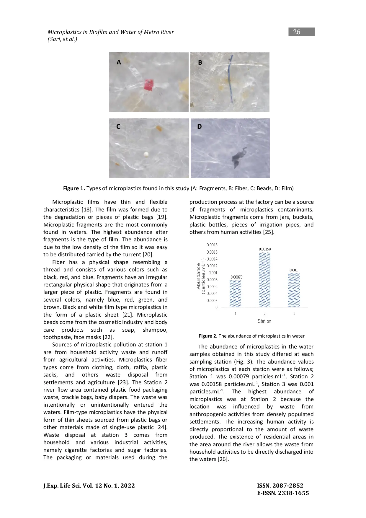 The Journal of Experimental Life ScienceThe Journal of Experimental Life ScienceSungai Metro mengalir dari hulu ke hilir melintasi Jawa Timur untuk mendukung berbagai aktivitas manusia seperti rumah tangga, toilet, atau pertanian. Pemanfaatan sungai air harus seimbang dengan pemantauan kualitas air sehingga kualitas air dapat dipantau. Penelitian ini bertujuan untuk menganalisis kelimpahan mikroplastik di Sungai Metro. Selain itu, parameter air (pH, oksigen terlarut, suhu, kecepatan aliran) juga diukur. Pengambilan sampel dilakukan di tiga stasiun yang berbeda, yaitu stasiun 1 yang mewakili area aktivitas pertanian, stasiun 2 yang mewakili area aktivitas rumah tangga, dan stasiun 3 yang mewakili aktivitas industri. Penelitian ini menunjukkan kelimpahan mikroplastik dalam matriks biofilm dan air sungai sekitarnya. Jenis mikroplastik adalah serat, fragmen, dan film. Kelimpahan total mikroplastik dalam air sungai berkisar antara 0,8 - 1,61 partikel.mL-1, sedangkan matriks biofilm berkisar antara 7,4 hingga 9,5 partikel.gram-1. Hasil parameter kualitas air di semua stasiun masih relatif baik dibandingkan dengan standar kualitas. Menurut pengetahuan kami, penelitian ini adalah studi pertama yang melaporkan mikroplastik dalam air dan biofilm yang terbentuk di Sungai Metro.