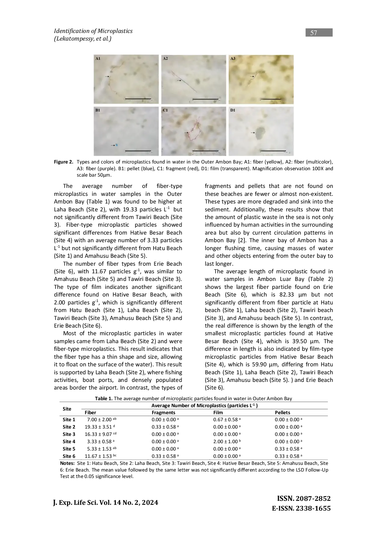 The Journal of Experimental Life ScienceThe Journal of Experimental Life SciencePenelitian ini bertujuan untuk mengidentifikasi akumulasi mikroplastik di perairan dan sedimen Teluk Ambon Luar menggunakan metode purposive sampling dan analisis deskriptif untuk data terkait jenis, warna, dan ukuran mikroplastik, serta uji beda signifikan terkecil sebagai uji lanjutan. Hasil penelitian menunjukkan bahwa perairan Teluk Ambon Luar telah tercemar oleh mikroplastik. Jumlah partikel mikroplastik yang ditemukan dalam sampel air pada tiga kedalaman berbeda (0, 50, dan 100 cm) adalah 201 partikel L-1, dan dalam sampel sedimen, 325 partikel g-1. Hal ini didukung oleh fakta bahwa jenis serat memiliki bentuk dan ukuran tipis dan dapat mengapung di permukaan air serta keberadaan pantai tempat terdapat aktivitas perikanan, pelabuhan perahu, sungai, dan area padat penduduk, serta sedimen berpasir dan berlumpur yang dapat menjebak lebih banyak mikroplastik selama periode pasang surut. Oleh karena itu, perlu dilakukan pencegahan terhadap masalah sampah di perairan Teluk Ambon.