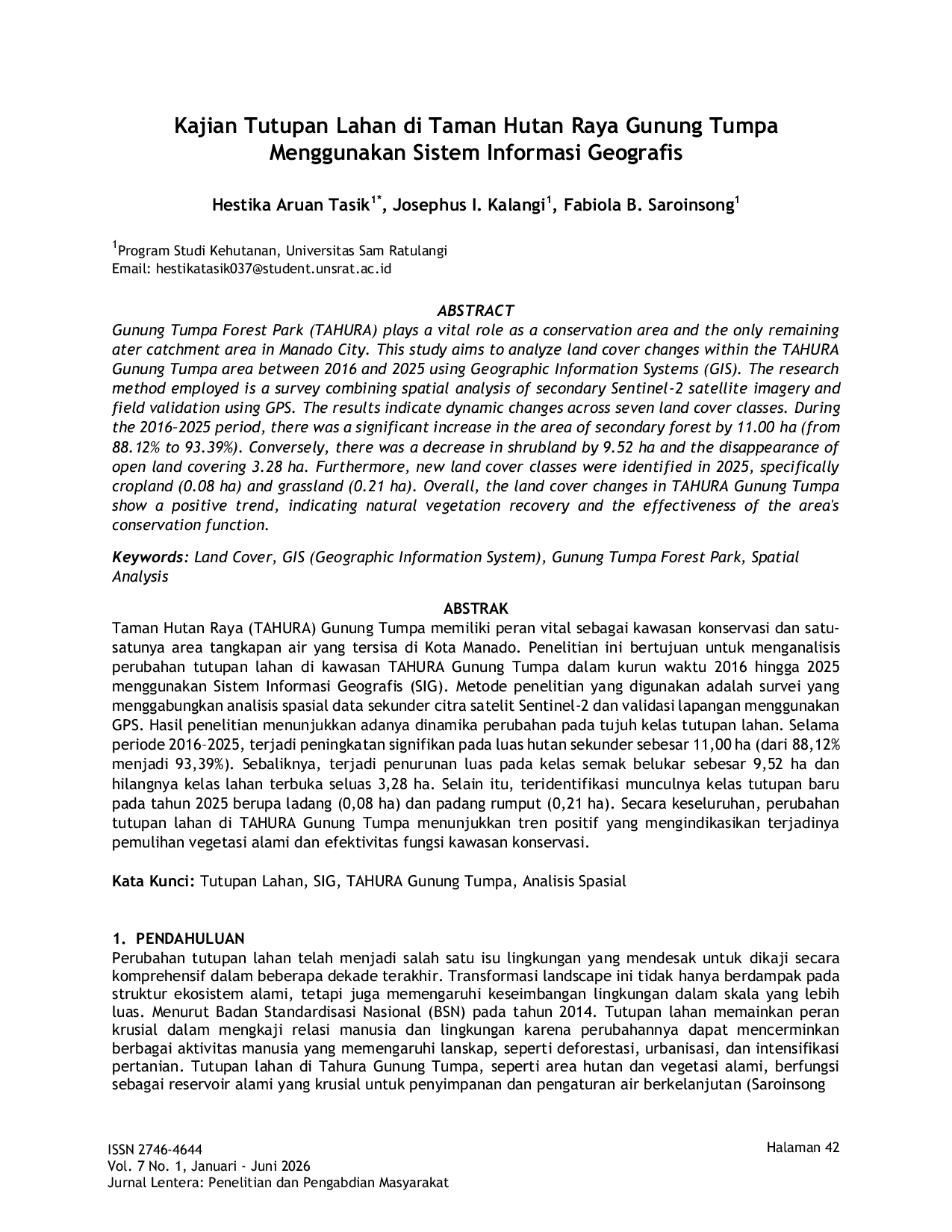 Jurnal Lentera: Penelitian dan Pengabdian MasyarakatJurnal Lentera: Penelitian dan Pengabdian MasyarakatTaman Hutan Raya (TAHURA) Gunung Tumpa memiliki peran vital sebagai kawasan konservasi dan satu-satunya area tangkapan air yang tersisa di Kota Manado. Penelitian ini bertujuan untuk menganalisis perubahan tutupan lahan di kawasan TAHURA Gunung Tumpa dalam kurun waktu 2016 hingga 2025 menggunakan Sistem Informasi Geografis (SIG). Metode penelitian yang digunakan adalah survei yang menggabungkan analisis spasial data sekunder citra satelit Sentinel-2 dan validasi lapangan menggunakan GPS. Hasil penelitian menunjukkan adanya dinamika perubahan pada tujuh kelas tutupan lahan. Selama periode 2016–2025, terjadi peningkatan signifikan pada luas hutan sekunder sebesar 11,00 ha (dari 88,12% menjadi 93,39%). Sebaliknya, terjadi penurunan luas pada kelas semak belukar sebesar 9,52 ha dan hilangnya kelas lahan terbuka seluas 3,28 ha. Selain itu, teridentifikasi munculnya kelas tutupan baru pada tahun 2025 berupa ladang (0,08 ha) dan padang rumput (0,21 ha). Secara keseluruhan, perubahan tutupan lahan di TAHURA Gunung Tumpa menunjukkan tren positif yang mengindikasikan terjadinya pemulihan vegetasi alami dan efektivitas fungsi kawasan konservasi.