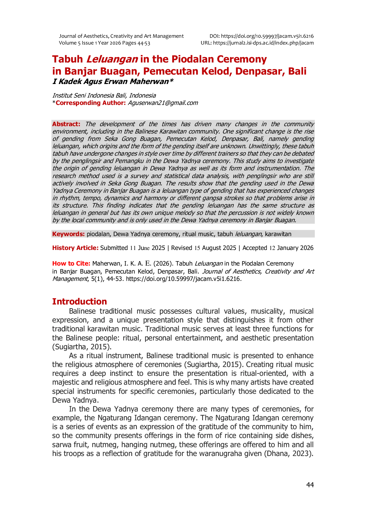 Journal of Aesthetics, Creativity and Art ManagementJournal of Aesthetics, Creativity and Art ManagementPerkembangan zaman telah mendorong banyak perubahan di lingkungan masyarakat, termasuk dalam komunitas Karawitan Bali. Salah satu perubahan signifikan adalah munculnya gending dari Seka Gong Buagan, Pemecutan Kelod, Denpasar, Bali, yaitu gending leluangan, yang asal-usul dan bentuk gending itu sendiri tidak diketahui. Tanpa disadari, tabuh-tabuh ini telah mengalami perubahan gaya seiring waktu oleh berbagai pelatih sehingga dapat diperdebatkan oleh penglingsir dan Pemangku dalam upacara Dewa Yadnya. Penelitian ini bertujuan untuk menyelidiki asal-usul gending leluangan dalam Dewa Yadnya serta bentuk dan instrumentasinya. Metode penelitian yang digunakan adalah survei dan analisis data statistik, dengan penglingsir yang masih aktif terlibat dalam Seka Gong Buagan. Hasil penelitian menunjukkan bahwa gending yang digunakan dalam Upacara Dewa Yadnya di Banjar Buagan adalah jenis gending leluangan yang telah mengalami perubahan dalam ritme, tempo, dinamika dan harmoni atau pukulan gangsa yang berbeda sehingga timbul masalah dalam strukturnya. Temuan ini menunjukkan bahwa gending leluangan memiliki struktur yang sama dengan leluangan pada umumnya tetapi memiliki melodi uniknya sendiri sehingga perkusi tersebut tidak dikenal secara luas oleh masyarakat setempat dan hanya digunakan dalam upacara Dewa Yadnya di Banjar Buagan.