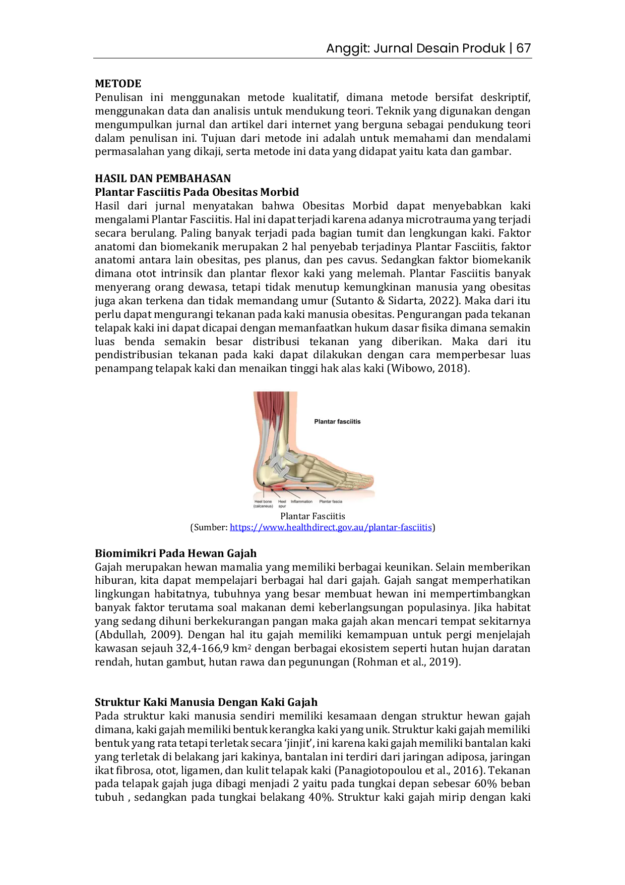 Anggit: Jurnal Desain ProdukAnggit: Jurnal Desain ProdukObesitas morbid merupakan obesitas tingkat teratas dalam BMI. Obesitas dapat menimbulkan penyakit flat foot yang berujung pada plantar fasciitis. Plantar fasciitis terjadi karena peradangan jaringan telapak kaki yang menghubungkan tumit dengan tungkai depan. Dapat terjadi karena microtrauma yang disebabkan oleh beban tubuh berlebih, sehingga fascia tertekan secara berulang. Pengambilan biomimikri hewan gajah digunakan untuk mengurangi masalah plantar fasciitis. Pada kaki hewan gajah terdapat bantalan tebal dan lebar, yang membantu gajah berjalan dan mendistribusikan beban gajah itu sendiri. Penambahan bantalan juga berlaku pada bagian insole alas kaki karena langsung bertemu dengan telapak kaki. Penambahan dilakukan dengan memberikan penopang arkus agar bekerja dengan ideal yaitu membantu mendistribusikan beban dan menjaga stabilitas dari manusia. Produk alas kaki digunakan untuk membantu manusia beraktivitas sehari-hari. Dengan adanya alas kaki sesuai dengan aktivitas yang dijalani, maka memberikan dampak positif kepada manusia agar lebih nyaman dan aman. Metode penulisan ini adalah kualitatif dimana pengambilan data dan teori dilakukan dari internet dari jurnal yang telah dipublikasi untuk memperkuat teori peramasalahan yang ada dan solusi untuk permasalahan tersebut. Penulisan ini dapat dikembangkan lebih dalam untuk dijadikan produk asli yang berguna bagi masyarakat seperti alas kaki yang mampu mendistribusikan beban terutama pada obesitas morbid.