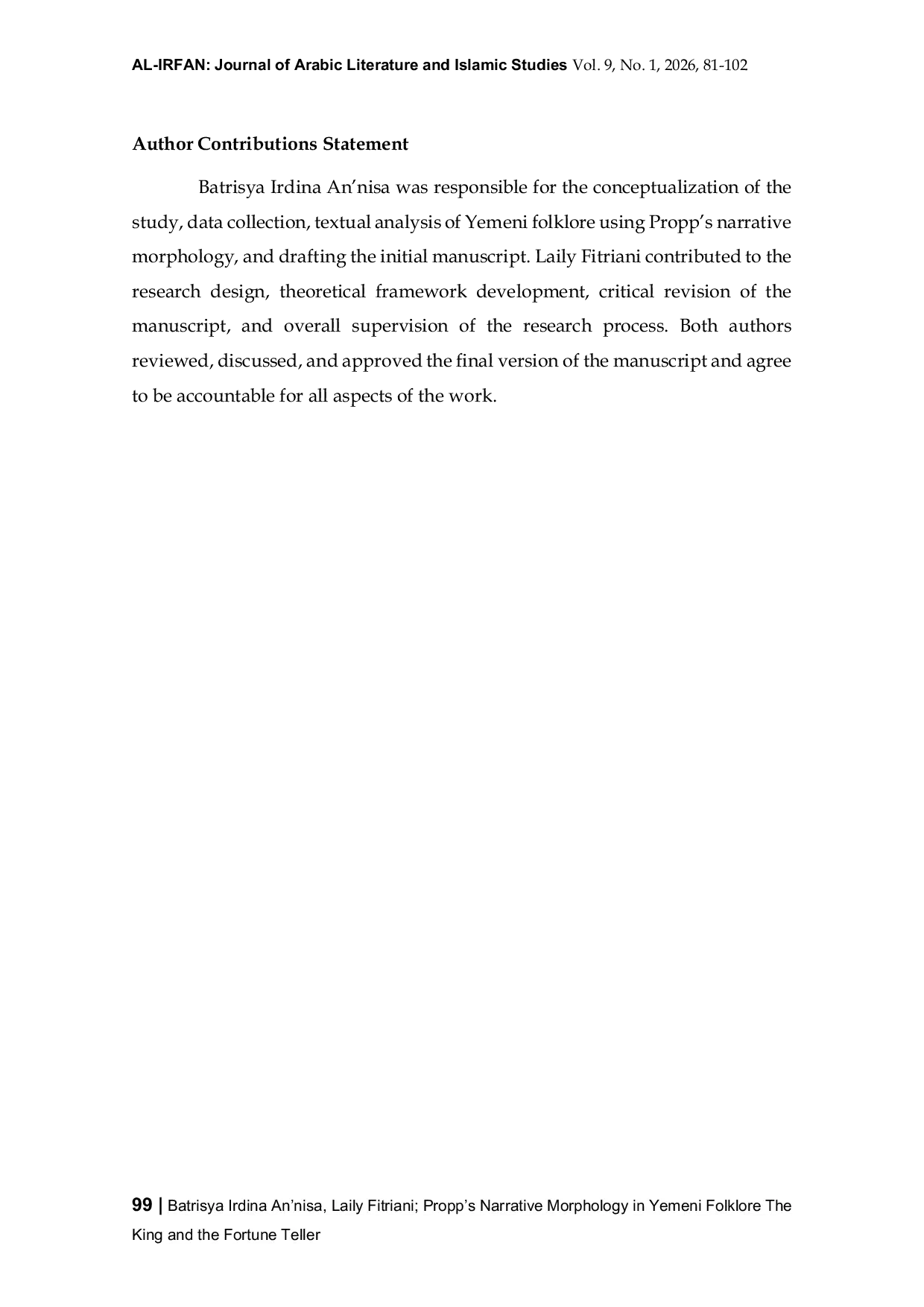 Al-Irfan : Journal of Arabic Literature and Islamic StudiesAl-Irfan : Journal of Arabic Literature and Islamic StudiesPrevious studies using Vladimir Propps theory have largely concentrated on German and Indonesian folklore, leaving a significant research gap in the analysis of narrative structures and character roles within Arabic oral literature. This study aims to identify the 31 narrative functions and 7 character traits present in Yemeni folktale ا لللللل لللللل ا لللللللللللللللما. This research employs a qualitative descriptive method supported by library research to gather and process textual materials. The result show that fourteen of Propps forty-one narrative functions, specifically α – Σ – γ – A – δ – D – T – Pr – Rs – H – W – Q – Q – W are present in the story. Only three of Propps seven-character categories appears in the narrative, namely the hero, villain, and helper. This research contributes to the field of Arabic narratology by providing a scientific record of Yemeni oral traditions and demonstrating that Propps structural patterns transcend cultural boundaries, thereby aiding in the preservation of Arab cultural heritage.