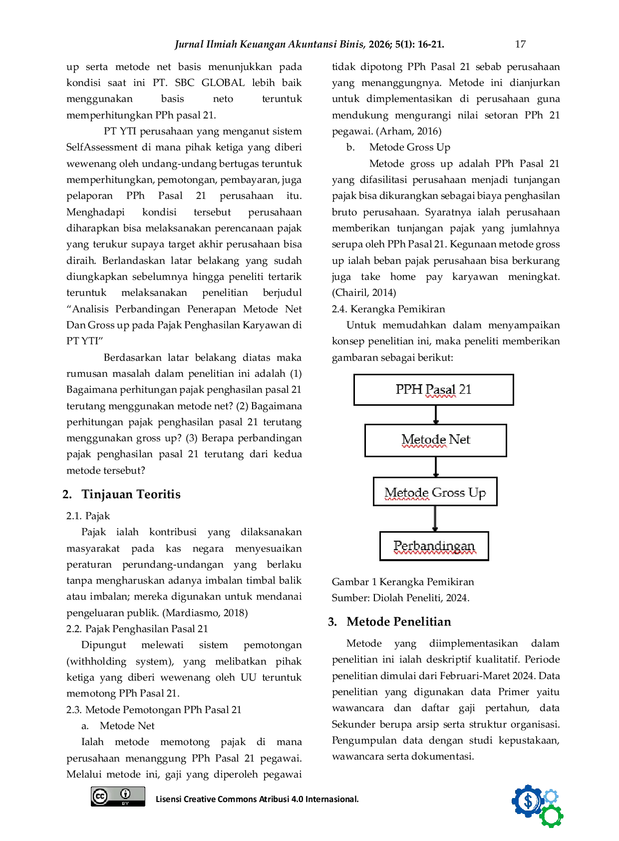 Jurnal Ilmiah Keuangan Akuntansi BisnisJurnal Ilmiah Keuangan Akuntansi BisnisPenelitian ini bertujuan untuk membandingkan perhitungan Pajak Penghasilan (PPh) Pasal 21 dengan menggunakan metode Net dan metode Gross Up pada gaji serta tunjangan karyawan tetap di PT YTI. Penelitian ini menggunakan metode deskriptif kualitatif dengan cara mengumpulkan, mengolah, dan menganalisis data untuk memperoleh gambaran yang jelas mengenai permasalahan yang diteliti. Jenis data yang digunakan dalam penelitian ini adalah data primer dan data sekunder yang diperoleh secara langsung dari perusahaan serta dari dokumen dan laporan pendukung lainnya. Analisis dilakukan dengan membandingkan hasil perhitungan PPh Pasal 21 menggunakan kedua metode tersebut untuk mengetahui metode yang lebih efisien bagi perusahaan. Hasil penelitian menunjukkan bahwa perhitungan PPh Pasal 21 dengan metode Net menghasilkan pajak terutang sebesar Rp9.350.400, sedangkan metode Gross Up menghasilkan pajak terutang sebesar Rp9.842.526. Selisih beban pajak antara kedua metode tersebut adalah sebesar Rp492.126. Meskipun metode Gross Up memberikan tambahan tunjangan pajak yang meningkatkan penghasilan karyawan, metode ini menyebabkan beban pajak perusahaan menjadi lebih besar. Oleh karena itu, metode Net dinilai lebih efisien dan lebih menguntungkan bagi perusahaan dalam pengelolaan kewajiban PPh Pasal 21.