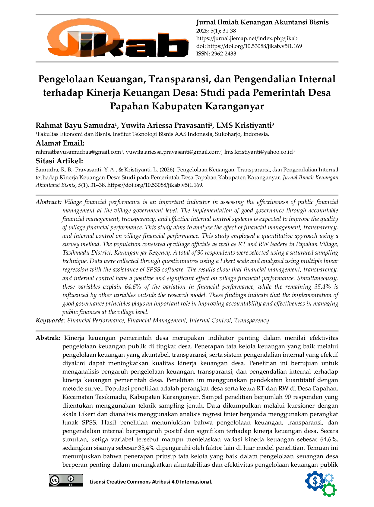 Jurnal Ilmiah Keuangan Akuntansi BisnisJurnal Ilmiah Keuangan Akuntansi BisnisKinerja keuangan pemerintah desa merupakan indikator penting dalam menilai efektivitas pengelolaan keuangan publik di tingkat desa. Penerapan tata kelola keuangan yang baik melalui pengelolaan keuangan yang akuntabel, transparansi, serta sistem pengendalian internal yang efektif diyakini dapat meningkatkan kualitas kinerja keuangan desa. Penelitian ini bertujuan untuk menganalisis pengaruh pengelolaan keuangan, transparansi, dan pengendalian internal terhadap kinerja keuangan pemerintah desa. Penelitian ini menggunakan pendekatan kuantitatif dengan metode survei. Populasi penelitian adalah perangkat desa serta ketua RT dan RW di Desa Papahan, Kecamatan Tasikmadu, Kabupaten Karanganyar. Sampel penelitian berjumlah 90 responden yang ditentukan menggunakan teknik sampling jenuh. Data dikumpulkan melalui kuesioner dengan skala Likert dan dianalisis menggunakan analisis regresi linier berganda menggunakan perangkat lunak SPSS. Hasil penelitian menunjukkan bahwa pengelolaan keuangan, transparansi, dan pengendalian internal berpengaruh positif dan signifikan terhadap kinerja keuangan desa. Secara simultan, ketiga variabel tersebut mampu menjelaskan variasi kinerja keuangan sebesar 64,6%, sedangkan sisanya sebesar 35,4% dipengaruhi oleh faktor lain di luar model penelitian. Temuan ini menunjukkan bahwa penerapan prinsip tata kelola yang baik dalam pengelolaan keuangan desa berperan penting dalam meningkatkan akuntabilitas dan efektivitas pengelolaan keuangan publik di tingkat desa.