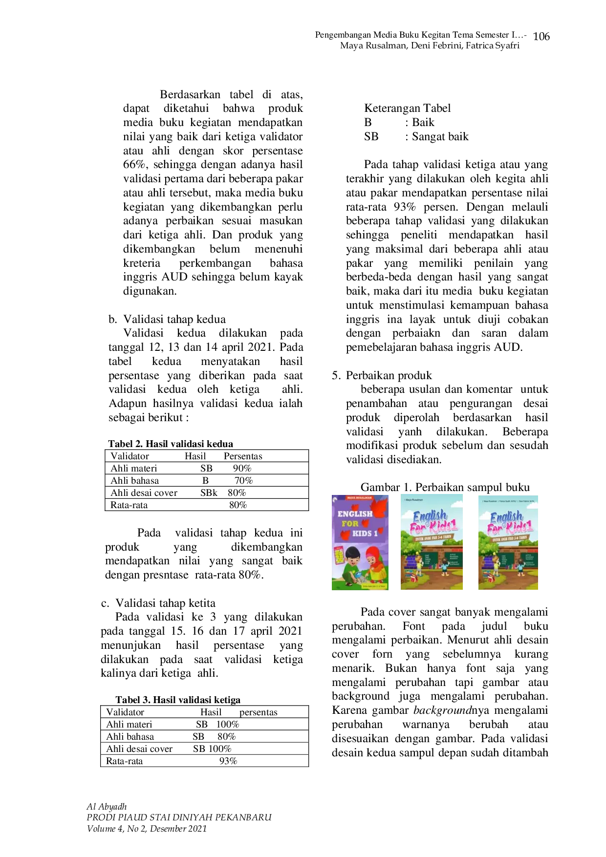 Al-AbyadhAl-AbyadhTujuan penelitian ini adalah untuk menghasilkan sebuah produk pengembangan media buku kegiatan tema pada pembelajaran semester satu, yaitu dengan tema diriku, lingkunganku, kebutuhanku, binatang, dan tanaman. Buku ini didesain dengan inovasi gambar dan warna yang menarik agar anak lebih tertarik untuk melihat dan mempelajarinya. Buku ini digunakan untuk meningkatkan kemampuan bahasa Inggris anak usia dini di RA As Shaffah Kota Bengkulu. Metode yang digunakan adalah search and development (R&D) dengan model pengembangan Richey and Klein pada level 1. Penelitian ini menggunakan desain penelitian dengan jumlah 14 anak (satu kelas) untuk mengetahui peningkatan bahasa Inggris anak. Teknik analisis data yang digunakan adalah analisis data kualitatif. Berdasarkan hasil analisis data, diperoleh kesimpulan bahwa produk baru hasil pengembangan sudah layak digunakan karena berada dalam kategori sangat baik, hal ini dibuktikan dengan penilaian dari validator.