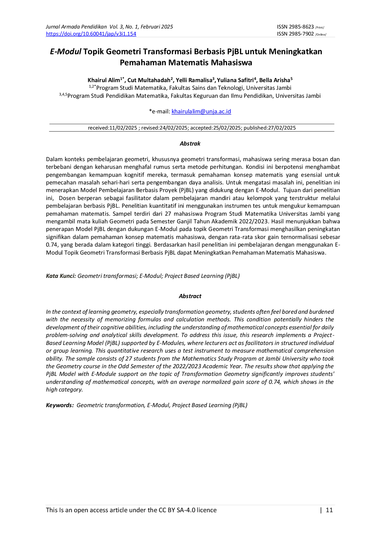 JURNAL ARMADA PENDIDIKANJURNAL ARMADA PENDIDIKANDalam konteks pembelajaran geometri, khususnya geometri transformasi, mahasiswa sering merasa bosan dan terbebani dengan keharusan menghafal rumus serta metode perhitungan. Kondisi ini berpotensi menghambat pengembangan kemampuan kognitif mereka, termasuk pemahaman konsep matematis yang esensial untuk pemecahan masalah sehari-hari serta pengembangan daya analisis. Untuk mengatasi masalah ini, penelitian ini menerapkan Model Pembelajaran Berbasis Proyek (PjBL) yang didukung dengan E-Modul. Tujuan dari penelitian ini, Dosen berperan sebagai fasilitator dalam pembelajaran mandiri atau kelompok yang terstruktur melalui pembelajaran berbasis PjBL. Penelitian kuantitatif ini menggunakan instrumen tes untuk mengukur kemampuan pemahaman matematis. Sampel terdiri dari 27 mahasiswa Program Studi Matematika Universitas Jambi yang mengambil mata kuliah Geometri pada Semester Ganjil Tahun Akademik 2022/2023. Hasil menunjukkan bahwa penerapan Model PjBL dengan dukungan E-Modul pada topik Geometri Transformasi menghasilkan peningkatan signifikan dalam pemahaman konsep matematis mahasiswa, dengan rata-rata skor gain ternormalisasi sebesar 0.74, yang berada dalam kategori tinggi.