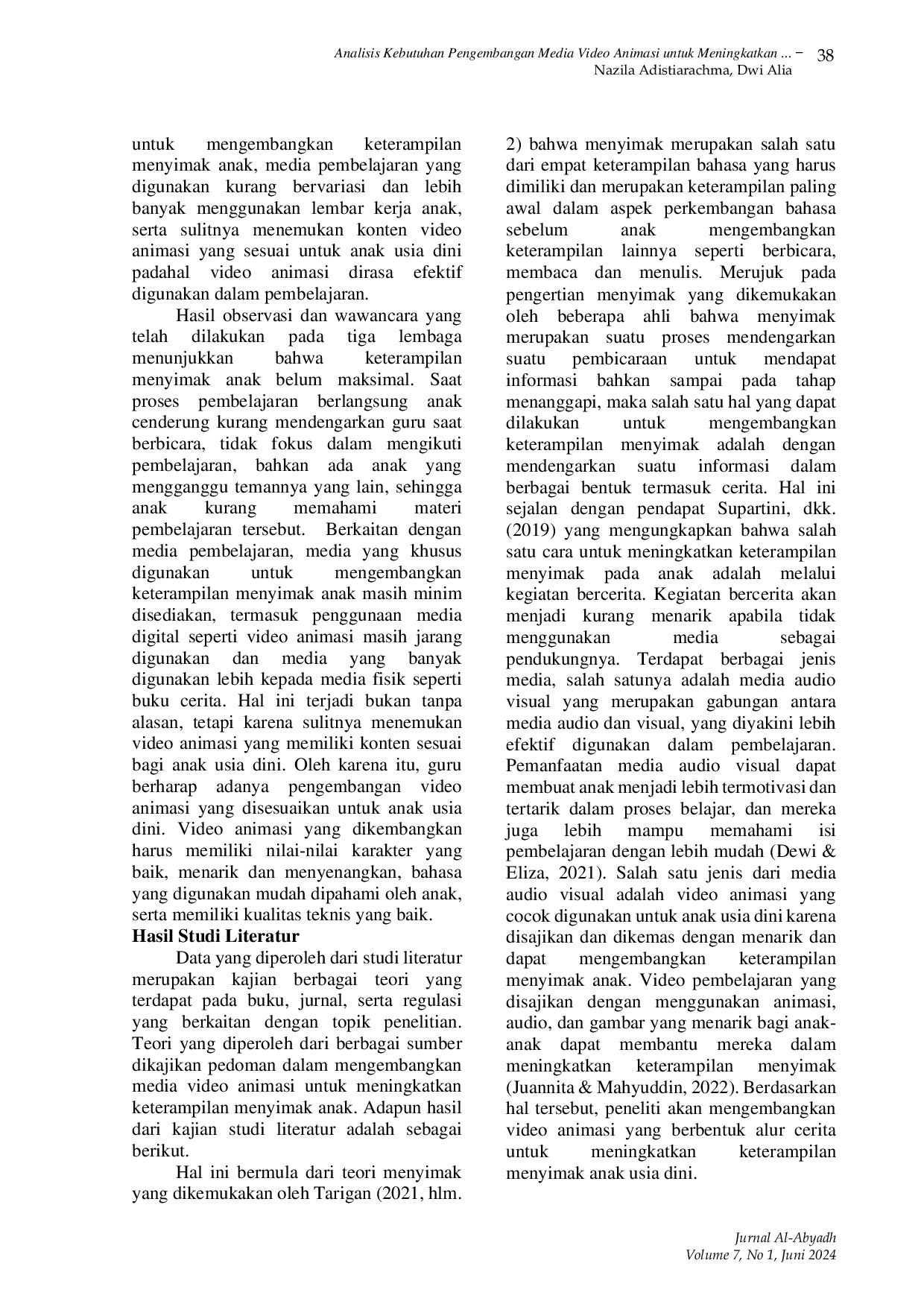 Al-AbyadhAl-AbyadhPerkembangan bahasa pada anak usia dini merupakan hal yang penting dan tidak boleh diabaikan. Bahasa memungkinkan anak dapat berkomunikasi, berinteraksi, serta bersosialisasi dengan lingkungan sekitarnya. Salah satu keterampilan berbahasa yang harus dimiliki oleh anak adalah menyimak. Menyimak merupakan keterampilan awal sebelum anak dapat berbicara, membaca, dan menulis. Anak yang memiliki keterampilan menyimak yang baik akan dapat mengoptimalkan proses belajarnya. Oleh karena itu, penting mengembangkan keterampilan menyimak anak. Hal tersebut dapat dilakukan dengan menggunakan media yang menarik bagi anak, salah satunya adalah dengan menggunakan video animasi. Berdasarkan hal tersebut, peneliti melakukan analisis dasar kebutuhan untuk mengetahui kebutuhan di lapangan terkait video animasi untuk selanjutnya dijadikan landasan dalam pengembangan media. Metode yang digunakan dalam penelitian ini adalah Research and Development dengan desain ADDIE. Hasil penelitian didasarkan pada dua hal yaitu hasil studi lapangan dan studi literatur. Berdasarkan hasil studi lapangan diperoleh data terkait permasalahan keterampilan menyimak anak serta minimnya media yang khusus digunakan untuk mengembangkan keterampilan menyimak. Hasil studi literatur menunjukkan bahwa keterampilan menyimak penting untuk dikembangkan melalui media yang menarik, salah satunya adalah dengan video animasi.