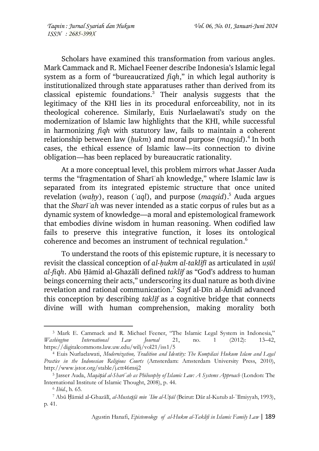 TAQNIN: Jurnal Syariah dan HukumTAQNIN: Jurnal Syariah dan HukumPenelitian ini mengeksplorasi epistemologi al-hukm al-taklifi dalam menjelaskan integrasi haqq (hak) dan iltizam (kewajiban) sebagai fondasi normatif dari Kompilasi Hukum Islam (KHI) di Indonesia. Tujuannya adalah untuk merekonstruksi kohesi moral hukum keluarga Islam dengan mengakarinya pada struktur epistemis taklif. Menggunakan pendekatan kualitatif dan normatif-filsafat, penelitian ini menganalisis teks-teks klasik ushul al-fiqh, termasuk karya-karya al-Ghazali, al-Amidi, dan al-Shatibi, serta pemikiran hukum modern tentang normativitas dan pluralisme Islam. Temuan mengungkapkan bahwa al-hukm al-taklifi berfungsi sebagai jembatan epistemis yang menghubungkan wahyu ilahi, kognisi rasional, dan tujuan moral. Namun, kodifikasi KHI telah memfragmentasi kesatuan ini dengan menekankan bentuk hukum daripada substansi etisnya. Mereintegrasi haqq dan iltizam dalam taklif memulihkan dimensi moral dan legitimasi teologis hukum. Penelitian ini menyimpulkan bahwa reformasi hukum keluarga Islam harus dimulai dengan rekonstruksi epistemis. Implikasi penelitian ini menyarankan bahwa taklif menyediakan kerangka universal untuk menyelaraskan wahyu dan akal, mengubah hukum Islam menjadi diskursus moral hidup yang berakar pada keadilan, belas kasihan, dan hikmah.