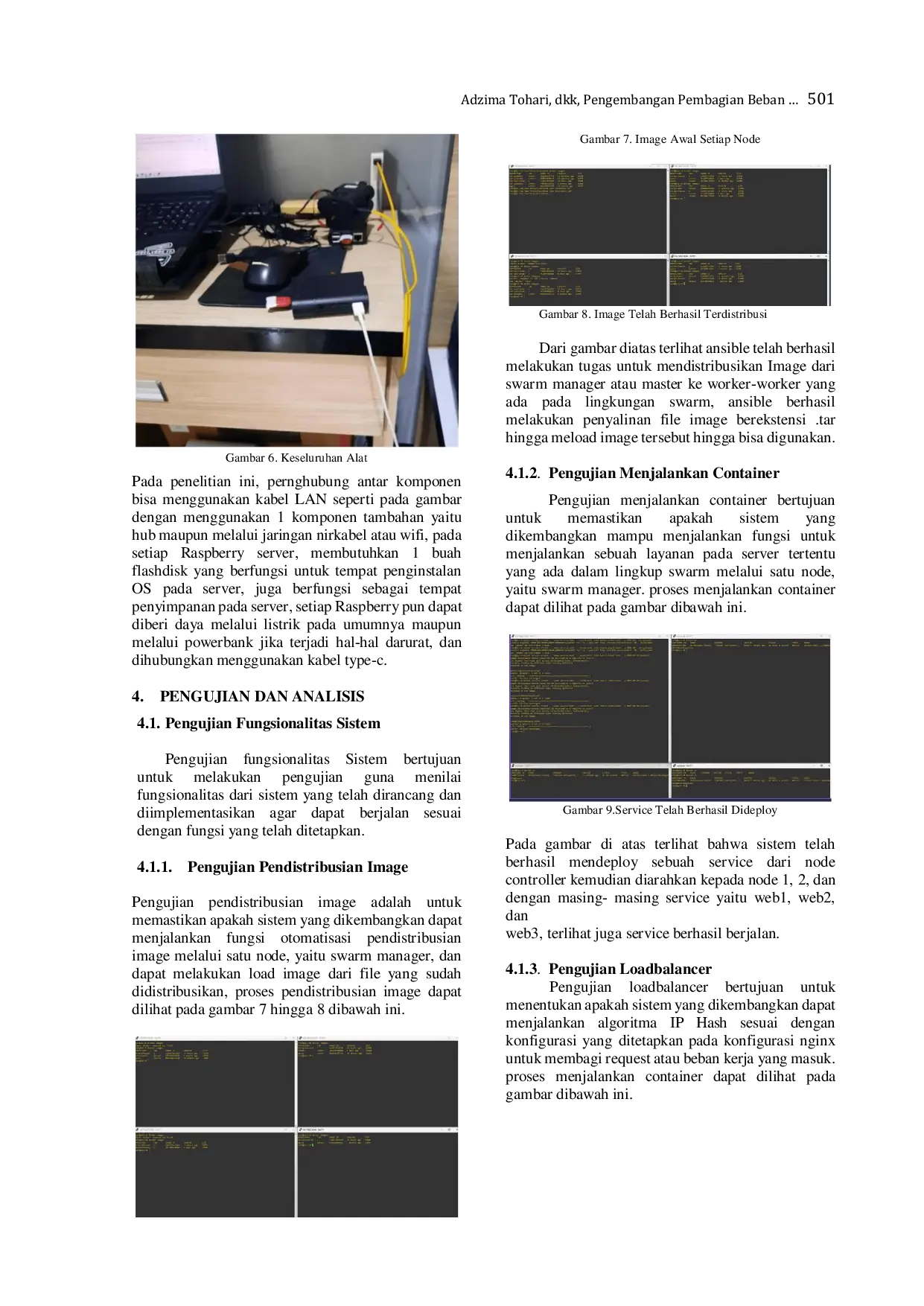 Jurnal Teknologi Informasi dan Ilmu KomputerJurnal Teknologi Informasi dan Ilmu KomputerPerkembangan teknologi saat ini mempercepat penyebaran informasi, hal ini meningkatkan traffic dan tekanan pada infrastruktur. Menghadapi ini, sistem yang reliable, availability, dan maintainability diperlukan. Dengan container dan Raspberry Pi sebagai server. Memberikan keunggulan selain 3 karakteristik sistem tersebut juga dari sumberdaya yang diperlukan. Raspberry Pi dapat terhubung ke jaringan LAN maupun nirkabel. Fokus penelitian ini pada perancangan dan implementasi sistem berbasis empat Raspberry Pi, tiga sebagai webserver Nginx, dan satu sebagai kontroler. Sistem ini menggunakan teknologi containerization di lingkungan DockerSwarm dan diintegrasikan Ansible untuk otomatisasi tugas. Tujuan penelitian ini adalah menciptakan sistem yang dapat disesuaikan dengan kebutuhan, memanfaatkan Raspberry Pi untuk efisiensi daya, dan memberikan manfaat dalam hal skalabilitas dan otomatisasi. Sistem ini menggunakan empat Raspberry Pi dengan algoritma IP HASH untuk pembagian beban kerja. Komponen utama mencakup input dari pengguna, pemrosesan beban kerja oleh load balancer, dan output melalui antarmuka web browser. Load balancer bertanggung jawab atas distribusi lalu lintas dan pemantauan status server untuk mengalihkan lalu lintas jika diperlukan. Pengujian menunjukkan system dengan load balancer lebih efisien dalam penggunaan CPU dengan perbandingan CPU 39.1% pada ws1 dengan loadbalancer dan 51.2% tanpa, 38.9% pada ws2 dengan loadbalancer dan 51.7% tanpa, serta 6.3% pada ws3 ketika mengalihkan request saat server 1 atau 2 mati dan efektif dalam mengalihkan request saat server bermasalah dengan persentase kegagalan melayani request sebesar 18% atau 18 request dari 1000 request sedangkan tanpa loadbalancer request tidak dapat dilayani ketika server yang dituju mati. Ini membuktikan reliable, availability, dan maintainability pada sistem ini terpenuhi.