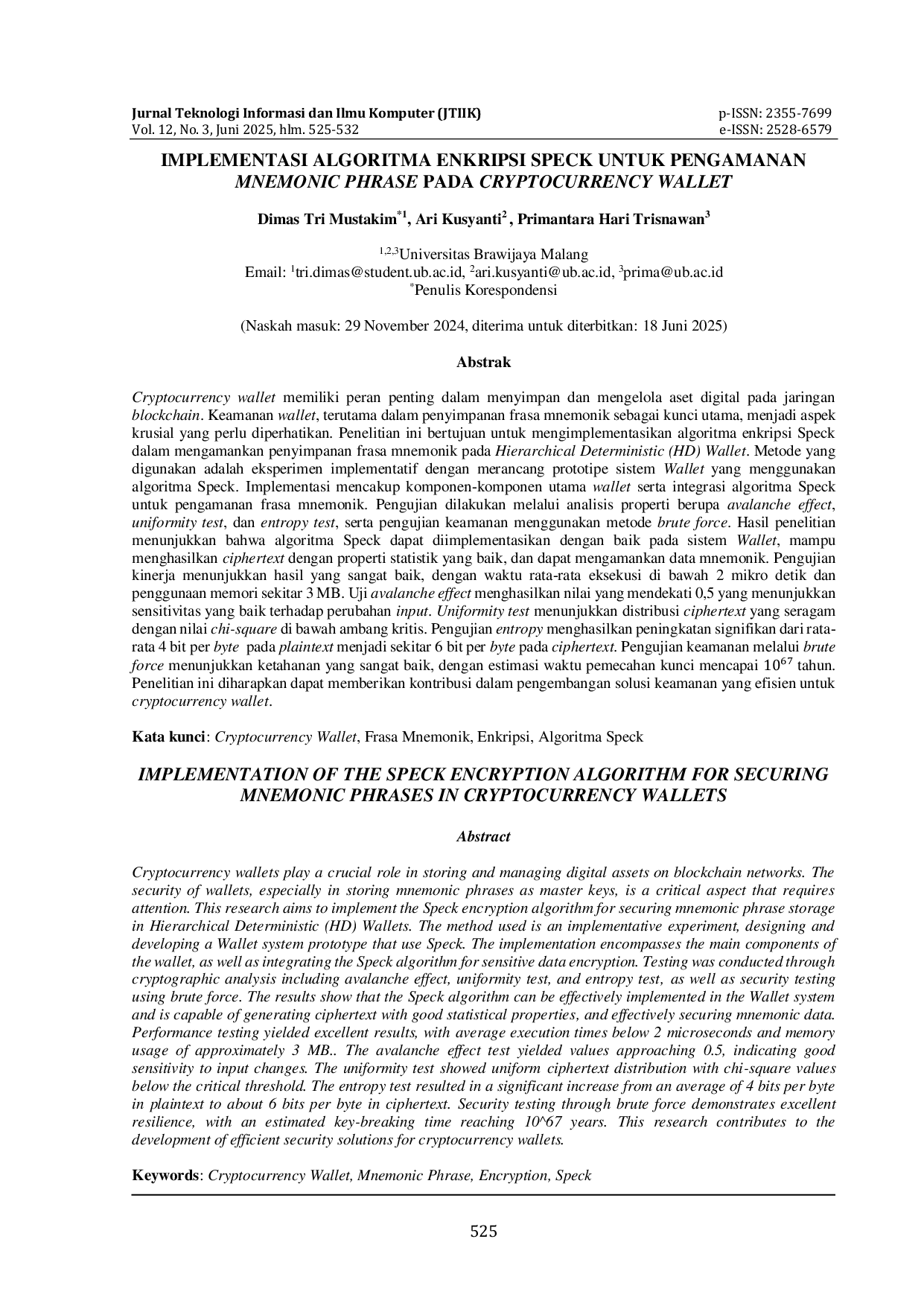 Jurnal Teknologi Informasi dan Ilmu KomputerJurnal Teknologi Informasi dan Ilmu KomputerCryptocurrency wallet memiliki peran penting dalam menyimpan dan mengelola aset digital pada jaringan blockchain. Keamanan wallet, terutama dalam penyimpanan frasa mnemonik sebagai kunci utama, menjadi aspek krusial yang perlu diperhatikan. Penelitian ini bertujuan untuk mengimplementasikan algoritma enkripsi Speck dalam mengamankan penyimpanan frasa mnemonik pada Hierarchical Deterministic (HD) Wallet. Metode yang digunakan adalah eksperimen implementatif dengan merancang prototipe sistem Wallet yang menggunakan algoritma Speck. Implementasi mencakup komponen-komponen utama wallet serta integrasi algoritma Speck untuk pengamanan frasa mnemonik. Pengujian dilakukan melalui analisis properti berupa avalanche effect, uniformity test, dan entropy test, serta pengujian keamanan menggunakan metode brute force. Hasil penelitian menunjukkan bahwa algoritma Speck dapat diimplementasikan dengan baik pada sistem Wallet, mampu menghasilkan ciphertext dengan properti statistik yang baik, dan dapat mengamankan data mnemonik. Pengujian kinerja menunjukkan hasil yang sangat baik, dengan waktu rata-rata eksekusi di bawah 2 mikro detik dan penggunaan memori sekitar 3 MB. Uji avalanche effect menghasilkan nilai yang mendekati 0,5 yang menunjukkan sensitivitas yang baik terhadap perubahan input. Uniformity test menunjukkan distribusi ciphertext yang seragam dengan nilai chi-square di bawah ambang kritis. Pengujian entropy menghasilkan peningkatan signifikan dari rata-rata 4 bit per byte pada plaintext menjadi sekitar 6 bit per byte pada ciphertext. Pengujian keamanan melalui brute force menunjukkan ketahanan yang sangat baik, dengan estimasi waktu pemecahan kunci mencapai 10^67 tahun. Penelitian ini diharapkan dapat memberikan kontribusi dalam pengembangan solusi keamanan yang efisien untuk cryptocurrency wallet.