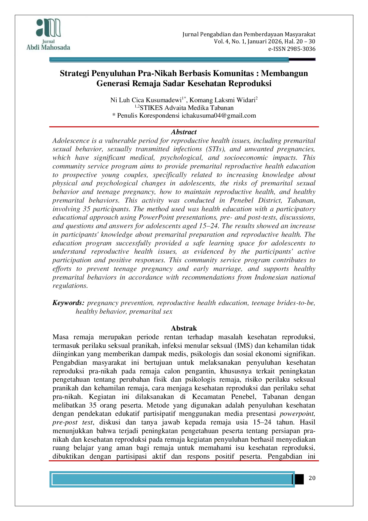 Jurnal Abdi MahosadaJurnal Abdi MahosadaMasa remaja merupakan periode rentan terhadap masalah kesehatan reproduksi, termasuk perilaku seksual pranikah, infeksi menular seksual (IMS) dan kehamilan tidak diinginkan yang memberikan dampak medis, psikologis dan sosial ekonomi signifikan. Pengabdian masyarakat ini bertujuan untuk melaksanakan penyuluhan kesehatan reproduksi pra-nikah pada remaja calon pengantin, khususnya terkait peningkatan pengetahuan tentang perubahan fisik dan psikologis remaja, risiko perilaku seksual pranikah dan kehamilan remaja, cara menjaga kesehatan reproduksi dan perilaku sehat pra-nikah. Kegiatan ini dilaksanakan di Kecamatan Penebel, Tabanan dengan melibatkan 35 orang peserta. Metode yang digunakan adalah penyuluhan kesehatan dengan pendekatan edukatif partisipatif menggunakan media presentasi powerpoint, pre-post test, diskusi dan tanya jawab kepada remaja usia 15–24 tahun. Hasil menunjukkan bahwa terjadi peningkatan pengetahuan peserta tentang persiapan pra-nikah dan kesehatan reproduksi pada remaja. Kegiatan penyuluhan berhasil menyediakan ruang belajar yang aman bagi remaja untuk memahami isu kesehatan reproduksi, dibuktikan dengan partisipasi aktif dan respons positif peserta. Pengabdian ini berkontribusi pada upaya pencegahan kehamilan remaja dan pernikahan dini, serta mendukung perilaku sehat pra-nikah sesuai rekomendasi regulasi nasional Indonesia.
