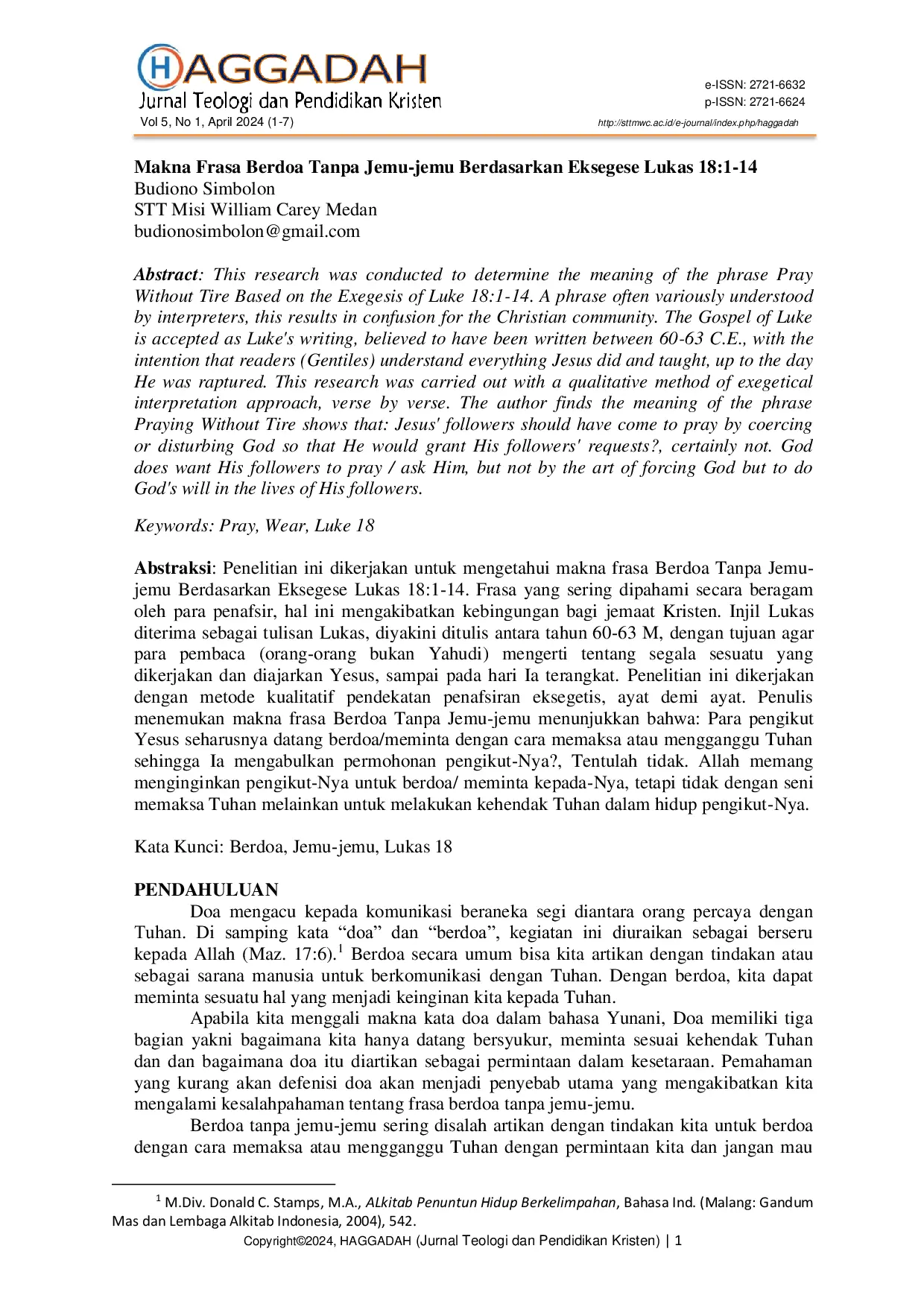 HAGGADAH: Jurnal Teologi dan Pendidikan KristenHAGGADAH: Jurnal Teologi dan Pendidikan KristenPenelitian ini dikerjakan untuk mengetahui makna frasa Berdoa Tanpa Jemu-jemu Berdasarkan Eksegese Lukas 18:1-14. Frasa yang sering dipahami secara beragam oleh para penafsir, hal ini mengakibatkan kebingungan bagi jemaat Kristen. Injil Lukas diterima sebagai tulisan Lukas, diyakini ditulis antara tahun 60-63 M, dengan tujuan agar para pembaca (orang-orang bukan Yahudi) mengerti tentang segala sesuatu yang dikerjakan dan diajarkan Yesus, sampai pada hari Ia terangkat. Penelitian ini dikerjakan dengan metode kualitatif pendekatan penafsiran eksegetis, ayat demi ayat. Penulis menemukan makna frasa Berdoa Tanpa Jemu-jemu menunjukkan bahwa: Para pengikut Yesus seharusnya datang berdoa/meminta dengan cara memaksa atau mengganggu Tuhan sehingga Ia mengabulkan permohonan pengikut-Nya?, Tentulah tidak. Allah memang menginginkan pengikut-Nya untuk berdoa/ meminta kepada-Nya, tetapi tidak dengan seni memaksa Tuhan melainkan untuk melakukan kehendak Tuhan dalam hidup pengikut-Nya.