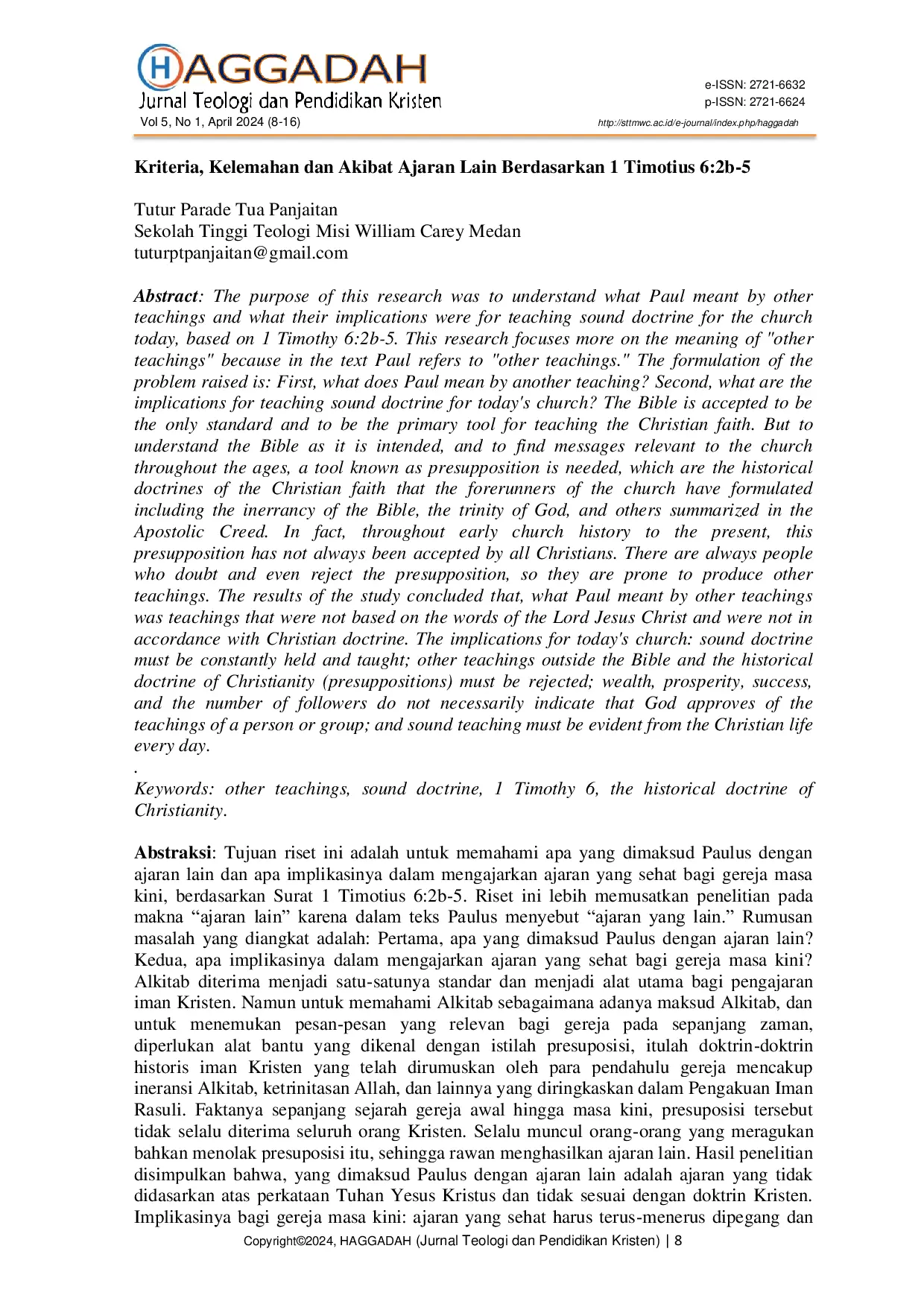 HAGGADAH: Jurnal Teologi dan Pendidikan KristenHAGGADAH: Jurnal Teologi dan Pendidikan KristenTujuan riset ini adalah untuk memahami apa yang dimaksud Paulus dengan ajaran lain dan apa implikasinya dalam mengajarkan ajaran yang sehat bagi gereja masa kini, berdasarkan Surat 1 Timotius 6:2b-5. Riset ini lebih memusatkan penelitian pada makna “ajaran lain karena dalam teks Paulus menyebut “ajaran yang lain. Rumusan masalah yang diangkat adalah: Pertama, apa yang dimaksud Paulus dengan ajaran lain? Kedua, apa implikasinya dalam mengajarkan ajaran yang sehat bagi gereja masa kini? Alkitab diterima menjadi satu-satunya standar dan menjadi alat utama bagi pengajaran iman Kristen. Namun untuk memahami Alkitab sebagaimana adanya maksud Alkitab, dan untuk menemukan pesan-pesan yang relevan bagi gereja pada sepanjang zaman, diperlukan alat bantu yang dikenal dengan istilah presuposisi, itulah doktrin-doktrin historis iman Kristen yang telah dirumuskan oleh para pendahulu gereja mencakup ineransi Alkitab, ketrinitasan Allah, dan lainnya yang diringkaskan dalam Pengakuan Iman Rasuli. Faktanya sepanjang sejarah gereja awal hingga masa kini, presuposisi tersebut tidak selalu diterima seluruh orang Kristen. Selalu muncul orang-orang yang meragukan bahkan menolak presuposisi tersebut, sehingga rawan menghasilkan ajaran lain. Hasil penelitian disimpulkan bahwa, yang dimaksud Paulus dengan ajaran lain adalah ajaran yang tidak didasarkan atas perkataan Tuhan Yesus Kristus dan tidak sesuai dengan doktrin Kristen. Implikasinya bagi gereja masa kini: ajaran yang sehat harus terus-menerus dipegang dan diajarkan; ajaran lain di luar Alkitab dan doktrin historis kekristenan (presuposisi) harus ditolak; kekayaan, kemakmuran, keberhasilan dan banyaknya pengikut tidak selalu menandakan bahwa Allah menyetujui ajaran seseorang maupun kelompok; dan ajaran yang sehat harus tampak dari kehidupan Kristen setiap hari.