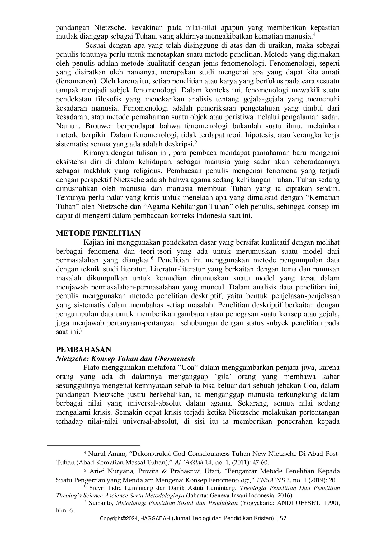HAGGADAH: Jurnal Teologi dan Pendidikan KristenHAGGADAH: Jurnal Teologi dan Pendidikan KristenPenelitian ini mengeksplorasi tantangan yang dihadapi oleh Indonesia, sebuah negara yang dikenal dengan keragaman agama, budaya, suku, dan ras, dalam menghadapi berbagai masalah sosial, politik, ekonomi, dan konflik SARA. Fokus utama penelitian adalah krisis dalam sistem keagamaan yang melibatkan pelanggaran HAM dan pelanggaran kebebasan berkeyakinan. Penelitian ini menggunakan metode kualitatif dengan pendekatan deskriptif untuk menganalisis. Hasil penelitian menunjukkan bahwa negara Indonesia menghadapi krisis yang signifikan terkait dengan agama, yang disebabkan oleh faktor politik dan stereotipe antar kelompok beragama. Namun, penelitian ini juga mencatat bahwa upaya penegak hukum dan pemerintah untuk mempertahankan prinsip negara kesatuan telah mengurangi potensi konflik. Konsep mayoritas-minoritas masih menjadi sumber konflik, dan prinsip Bhineka Tunggal Ika perlu didistribusikan dengan lebih baik. Penelitian ini juga mencatat hubungan antara situasi di Indonesia dan pemikiran Nietzsche tentang Kematian Tuhan, yang memunculkan pertanyaan tentang eksistensi dan peran agama dalam masyarakat.
