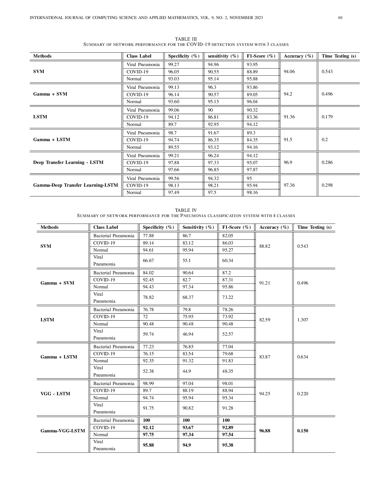 Sistem klasifikasi pneumonia berbasis citra rontgen dada menggunakan pendekatan machine learning dan deep learning berhasil dikembangkan dalam penelitian ini.Kombinasi Gamma Correction dan VGG-LSTM memberikan akurasi tertinggi, yaitu 96,88%, yang lebih baik dibandingkan tanpa penerapan Gamma Correction.Tahap pra-pemrosesan dengan koreksi gamma memberikan pengaruh signifikan terhadap kinerja klasifikasi pneumonia.