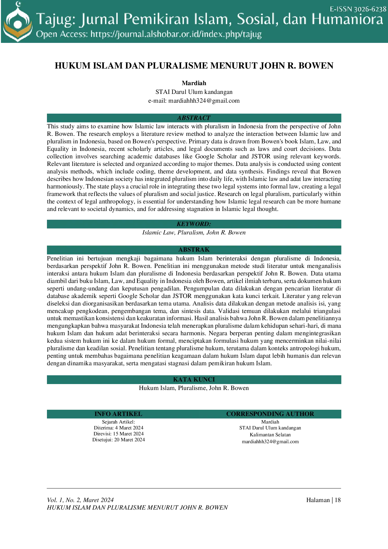 Tajug: Jurnal Pemikiran Islam, Sosial, dan HumanioraTajug: Jurnal Pemikiran Islam, Sosial, dan HumanioraPenelitian ini bertujuan untuk mengkaji bagaimana hukum Islam berinteraksi dengan pluralisme di Indonesia, berdasarkan perspektif John R. Bowen. Penelitian ini menggunakan metode studi literatur untuk menganalisis interaksi antara hukum Islam dan pluralisme di Indonesia berdasarkan perspektif John R. Bowen. Data utama diambil dari buku Islam, Law, and Equality in Indonesia oleh Bowen, artikel ilmiah terbaru, serta dokumen hukum seperti undang-undang dan keputusan pengadilan. Pengumpulan data dilakukan dengan pencarian literatur di database akademik seperti Google Scholar dan JSTOR menggunakan kata kunci terkait. Literatur yang relevan diseleksi dan diorganisasikan berdasarkan tema utama. Analisis data dilakukan dengan metode analisis isi, yang mencakup pengkodean, pengembangan tema, dan sintesis data. Validasi temuan dilakukan melalui triangulasi untuk memastikan konsistensi dan keakuratan informasi. Hasil analisis menunjukkan bahwa John R. Bowen dalam penelitiannya mengungkapkan bahwa masyarakat Indonesia telah menerapkan pluralisme dalam kehidupan sehari-hari, di mana hukum Islam dan hukum adat berinteraksi secara harmonis. Negara berperan penting dalam mengintegrasikan kedua sistem hukum ini ke dalam hukum formal, menciptakan formulasi hukum yang mencerminkan nilai-nilai pluralisme dan keadilan sosial. Penelitian tentang pluralisme hukum, terutama dalam konteks antropologi hukum, penting untuk membahas bagaimana penelitian keagamaan dalam hukum Islam dapat lebih humanis dan relevan dengan dinamika masyarakat, serta mengatasi stagnasi dalam pemikiran hukum Islam.