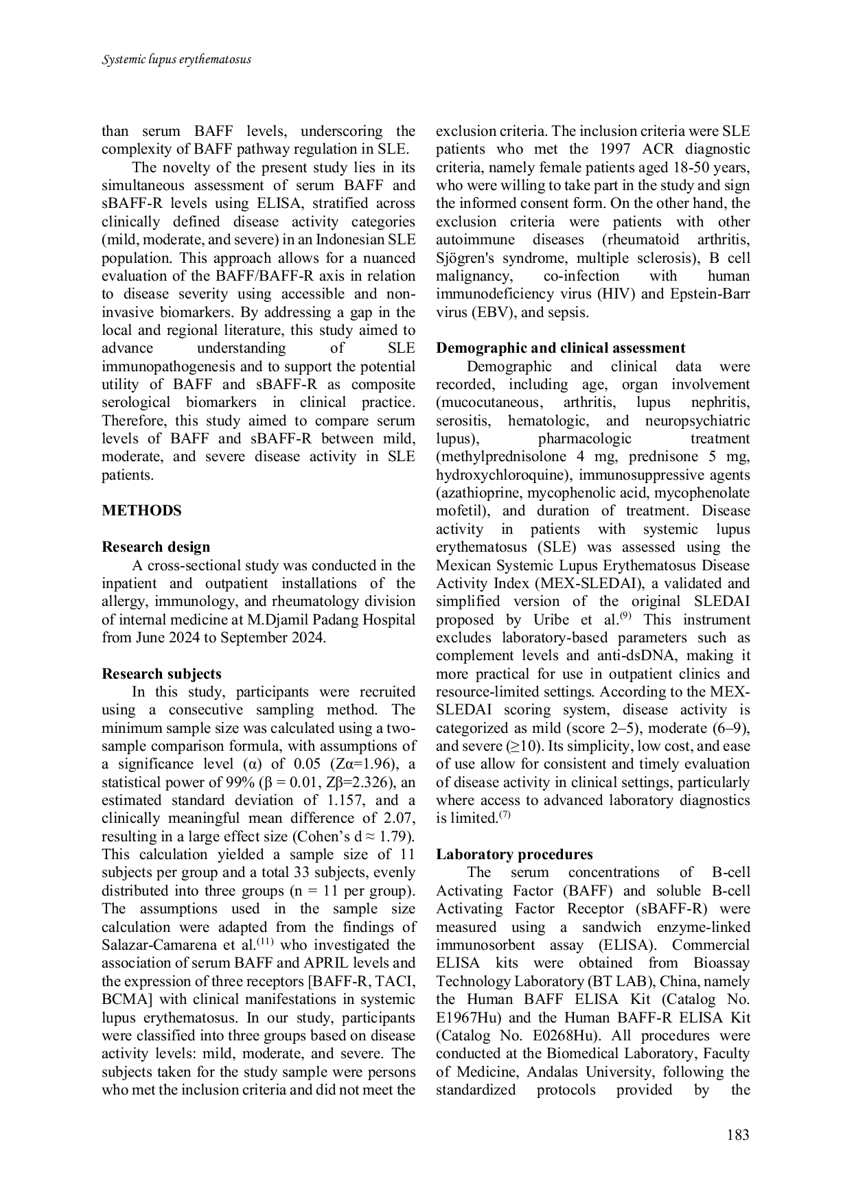 Universa MedicinaUniversa MedicinaBACKGROUND: Systemic lupus erythematosus (SLE) is caused by B-cell hyperactivity, which stimulates the production of autoantibodies, leading to the formation of immune complexes and resulting in tissue damage. Increased B-cell activation is associated with disease activity in SLE. The cytokine B-cell Activating Factor (BAFF) and its soluble BAFF receptor (sBAFF-R) play a crucial role in B-cell activation and survival. Their serum levels may serve as potential biomarkers for SLE severity. This study aimed to compare serum levels of BAFF and sBAFF-R between SLE patients with mild, moderate, and severe disease activity.. . METHODS: A cross-sectional study was conducted involving 33 female SLE patients. Subjects were divided into mild, moderate, and severe disease activity groups. Disease activity was assessed using Mexican Systemic Lupus Erythematosus Disease Activity Index (MEX-SLEDAI) scores. Serum BAFF and sBAFF-R levels were measured using ELISA. Data were analyzed using the Kruskal–Wallis and Mann-Whitney tests. A p-value < 0.05 was considered statistically significant.. . RESULTS: The median serum BAFF level in SLE patients was 0.51 ng/mL, and 4.66 ng/mL in sBAFF-R level.There was a statistically significant difference in serum BAFF and sBAFF-R levels between mild, moderate, and severe disease activity among SLE patients (p<0.0001).