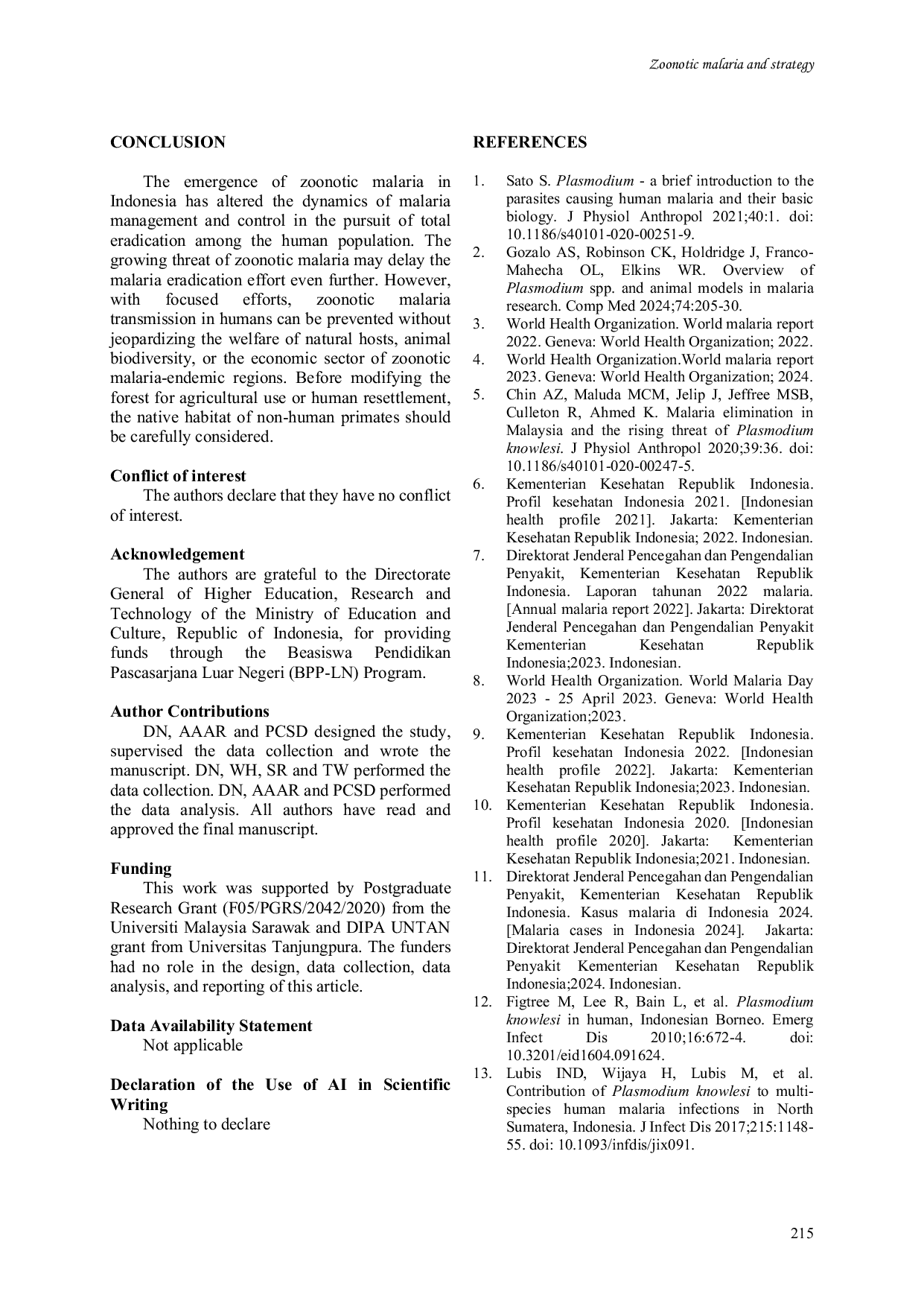 Munculnya malaria zoonosis di Indonesia telah mengubah dinamika pengendalian dan manajemen malaria dalam upaya pemberantasan total di populasi manusia.Ancaman meningkatnya malaria zoonosis dapat memperlambat upaya pemberantasan malaria lebih lanjut.Namun, dengan upaya yang terfokus, transmisi malaria zoonosis pada manusia dapat dicegah tanpa membahayakan kesejahteraan inang alami, keanekaragaman hayati hewan, maupun sektor ekonomi di wilayah yang endemis malaria zoonosis.