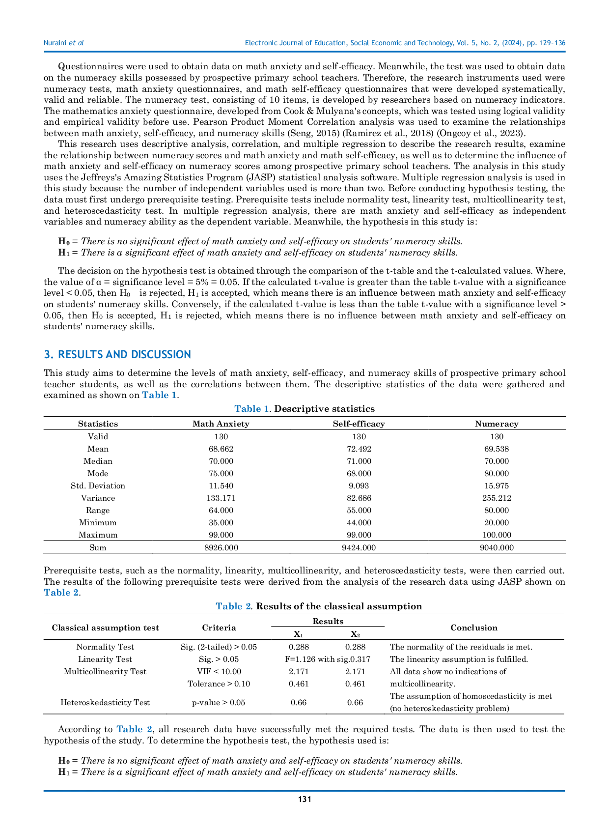 Electronic Journal of Education, Social Economics and TechnologyElectronic Journal of Education, Social Economics and TechnologyPenelitian ini menyelidiki hubungan antara kecemasan matematika, kepercayaan diri, dan kemampuan numerasi di kalangan calon guru sekolah dasar di Universitas Negeri Malang. Melalui metode kuantitatif, data dikumpulkan dari 130 peserta menggunakan kuesioner terstruktur dan tes numerasi. Analisis statistik deskriptif dan korelasi dilakukan untuk menilai sejauh mana kecemasan matematika dan kepercayaan diri mempengaruhi kinerja numerasi. Temuan mengungkapkan korelasi yang lemah tetapi signifikan secara statistik, dengan kecemasan matematika yang mempengaruhi kinerja numerasi secara negatif dan kepercayaan diri menunjukkan asosiasi positif. Namun, kedua variabel ini bersama-sama hanya menjelaskan 3,5% dari variasi kinerja numerasi, meninggalkan 96,5% prediktor potensial yang belum diperiksa. Hal ini menunjukkan bahwa faktor psikologis seperti kecemasan matematika dan kepercayaan diri, meskipun penting, memainkan peran yang kurang langsung dalam membentuk kemampuan numerasi daripada yang diasumsikan secara tradisional. Hasil penelitian ini menekankan kebutuhan akan pendekatan yang lebih luas dan integratif dalam memahami sifat multikultural kompetensi matematika. Studi lanjutan dianjurkan untuk menyelidiki faktor-faktor kontributor tambahan, seperti pengaruh kognitif dan lingkungan, serta memperluas ukuran sampel untuk generalisasi yang lebih luas. Temuan ini memiliki implikasi dalam merancang intervensi yang secara bersamaan menargetkan elemen psikologis dan kontekstual untuk meningkatkan kemampuan numerasi di kalangan calon pendidik.