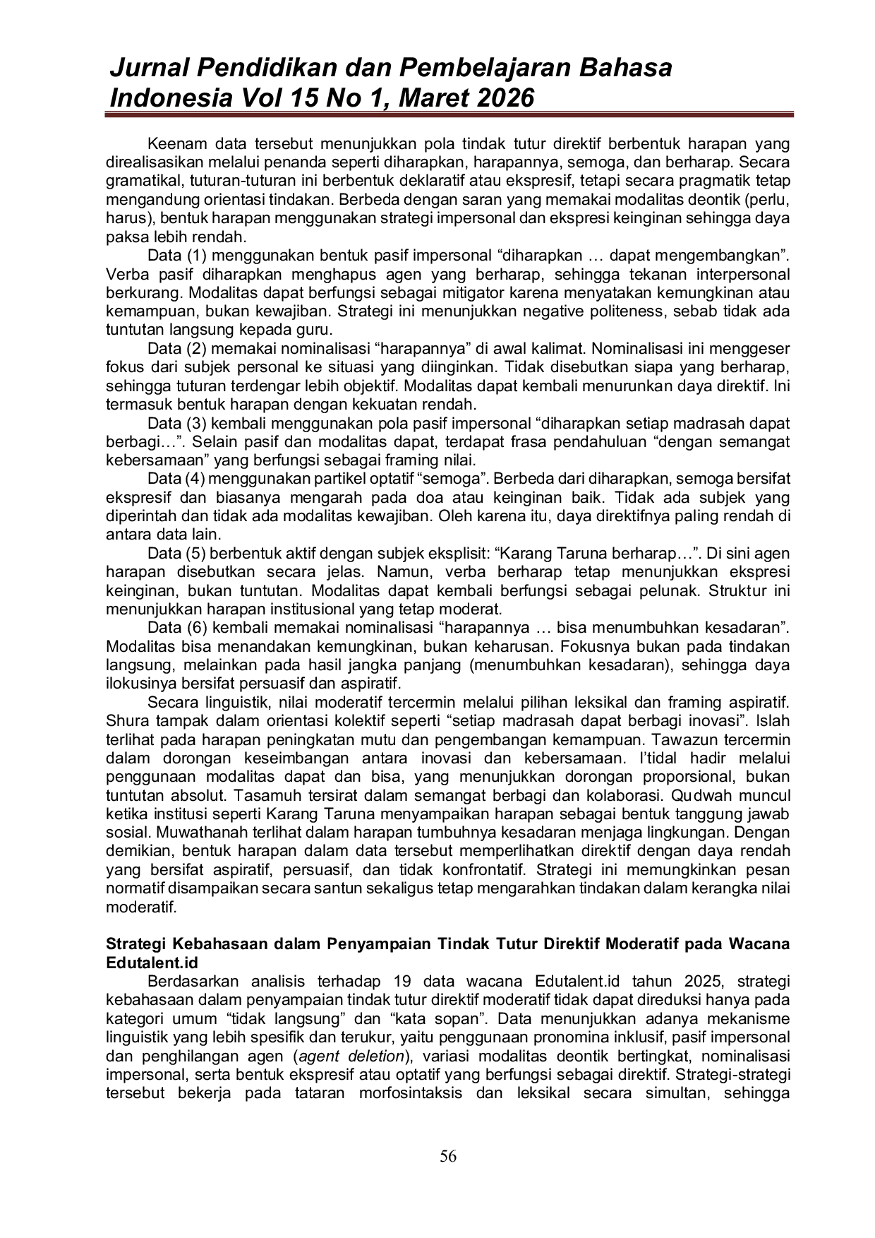 Jurnal Pendidikan dan Pembelajaran Bahasa IndonesiaJurnal Pendidikan dan Pembelajaran Bahasa IndonesiaPenelitian ini bertujuan mendeskripsikan bentuk, fungsi, dan strategi kebahasaan tindak tutur direktif moderatif dalam wacana Edutalent.id tahun 2025. Direktif moderatif didefinisikan sebagai tindak tutur yang bertujuan memengaruhi tindakan mitra tutur melalui strategi mitigasi linguistik sehingga daya paksa berada pada tingkat rendah hingga moderat dan tidak direalisasikan dalam bentuk perintah langsung yang koersif. Penelitian menggunakan pendekatan deskriptif kualitatif dengan landasan teori tindak tutur Searle dan teori kesantunan Brown dan Levinson. Data berupa wacana tulis yang dipublikasikan selama Januari–Desember 2025, dengan total 19 tuturan yang memenuhi kriteria direktif moderatif. Analisis dilakukan menggunakan metode padan pragmatik dengan mempertimbangkan konteks institusional dan tujuan komunikasi. Hasil penelitian menunjukkan tiga bentuk dominan, yaitu ajakan (6 data), saran (7 data), dan harapan (6 data). Strategi linguistik yang digunakan meliputi (1) pronomina inklusif sebagai mitigator solidaritas, (2) pasif impersonal dan penghilangan agen (agent deletion), (3) variasi modalitas deontik bertingkat seperti perlu, hendaknya, dan harus, (4) nominalisasi dan konstruksi impersonal, serta (5) bentuk ekspresif dan optatif seperti diharapkan dan semoga. Kombinasi strategi tersebut menunjukkan bahwa daya direktif direalisasikan secara tidak langsung dengan spektrum tekanan yang terukur secara linguistik. Penelitian ini berkontribusi pada kajian pragmatik wacana digital dengan memperjelas mekanisme mitigasi direktif dalam komunikasi institusional berbasis media daring serta menawarkan pemetaan strategi linguistik yang dapat digunakan untuk menganalisis tingkat directive force dalam teks edukatif digital.