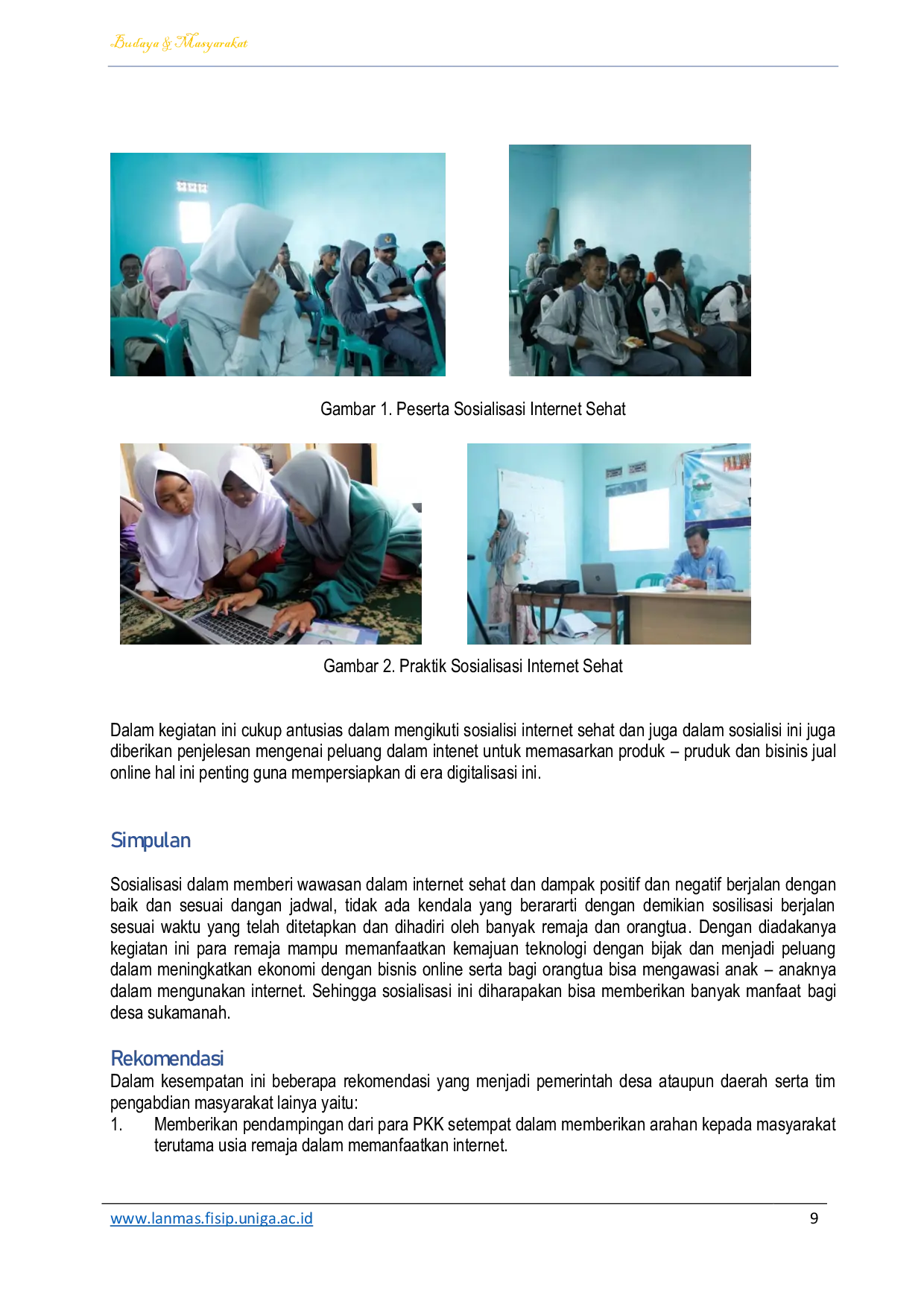 Jurnal Budaya Masyarakat (JBM)Jurnal Budaya Masyarakat (JBM)Di era informasi yang sangat maju ini memungkinkan setiap orang mudah terhubung ke intenet, di mana internet terhubung keseluruh dunia dengan begitu sangat mudah sekali untuk mengakses informasi yang tersebar di internet apapun jenisnya, sehingga dalam kondisi tersebut sangat berbahaya jika intenet digunakan dengan tidak sehat, khususnya kepada kalangan usia remaja begitu pula kehawatiran tim FISIP UNIGA kepada para remaja di Desa Sukamah Kecamatan Bayongbong Garut dalam mengunakan internet takut digunakan kepada hal-hal yang tidak benar seperti mebuka situs dewasa dan masih banyak lainnya, sehingga tim FISIP UNIGA megadakan sebuah sosialisasi memegenai internet sehat yang dilaksanakan dalam pengabdian masyarakat.