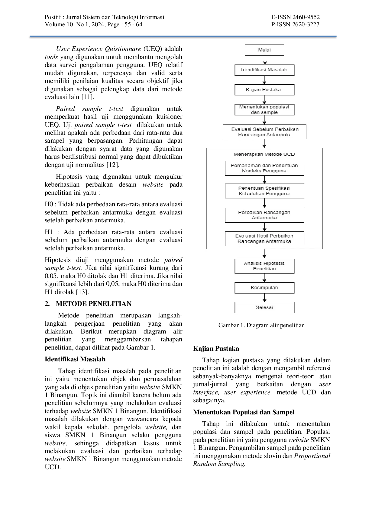 POSITIF : Jurnal Sistem dan Teknologi InformasiPOSITIF : Jurnal Sistem dan Teknologi InformasiWebsite SMKN 1 Binangun adalah sistem perangkat lunak berbasis website yang digunakan untuk menyampaikan informasi atau berita terbaru dari sekolah kepada siswa. Website ini mulai digunakan pada tahun 2020, namun dalam penggunaannya terdapat beberapa kendala yang dialami oleh user. Kendala tersebut antara lain antarmuka yang kurang baik dari segi desain, page layout dan konten website, selain itu dari segi tampilan website yang kurang menarik dan kurang memberi daya pikat pengguna serta kurangnya keterbaruan. Berdasarkan permasalahan tersebut, maka dibutuhkan evaluasi dan perbaikan desain UI/UX untuk menghasilkan website yang sesuai dengan kebutuhan pengguna. Hasil dari penelitian ini yaitu perbaikan user interface website SMKN 1 Binangun dari sisi pengguna (front-end). Hasil pengujian usability testing menggunakan UEQ memperoleh penilaian comparisson to benchmark antara above average hingga good menandakan perbaikan desain website sudah baik dari desain sebelumnya, hal tersebut diperkuat dengan analisis hipotesis yang menyatakan hipotesis H0 ditolak dan H1 diterima sesuai dengan nilai rata-rata UEQ.