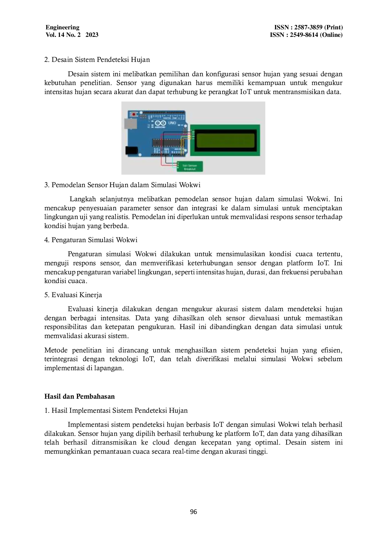 Engineering : Jurnal Bidang TeknikEngineering : Jurnal Bidang TeknikPenelitian ini bertujuan mengembangkan sistem pendeteksi hujan inovatif berbasis Internet of Things (IoT) dengan memanfaatkan simulasi Wokwi. Sistem ini dirancang untuk meningkatkan akurasi dan responsibilitas dalam mendeteksi curah hujan secara real-time. Integrasi teknologi IoT memungkinkan sensor hujan untuk terhubung ke platform cloud, memfasilitasi pemantauan jarak jauh dan analisis data secara efisien. Simulasi Wokwi digunakan sebagai alat uji untuk memvalidasi kinerja sistem pendeteksi hujan sebelum implementasi fisiknya. Proses pengembangan melibatkan pemodelan sensor hujan, pengaturan parameter simulasi, dan evaluasi performa. Dengan memanfaatkan fitur simulasi yang realistis, penelitian ini memungkinkan analisis mendalam terhadap respons sensor terhadap berbagai intensitas hujan. Hasil eksperimen menunjukkan bahwa sistem yang diusulkan mampu mendeteksi curah hujan dengan tingkat akurasi yang tinggi. Selain itu, integrasi IoT memberikan kemampuan untuk mengumpulkan dan menganalisis data secara kontinu, memungkinkan pemahaman yang lebih baik tentang pola cuaca lokal. Penggunaan simulasi Wokwi tidak hanya mempercepat pengembangan sistem, tetapi juga memastikan kehandalan dan konsistensi sebelum implementasi lapangan. Penelitian ini memberikan kontribusi positif terhadap pengembangan sistem pendeteksi hujan yang cerdas, berbasis IoT, dan dapat diintegrasikan dengan mudah dalam konteks aplikasi cuaca modern.