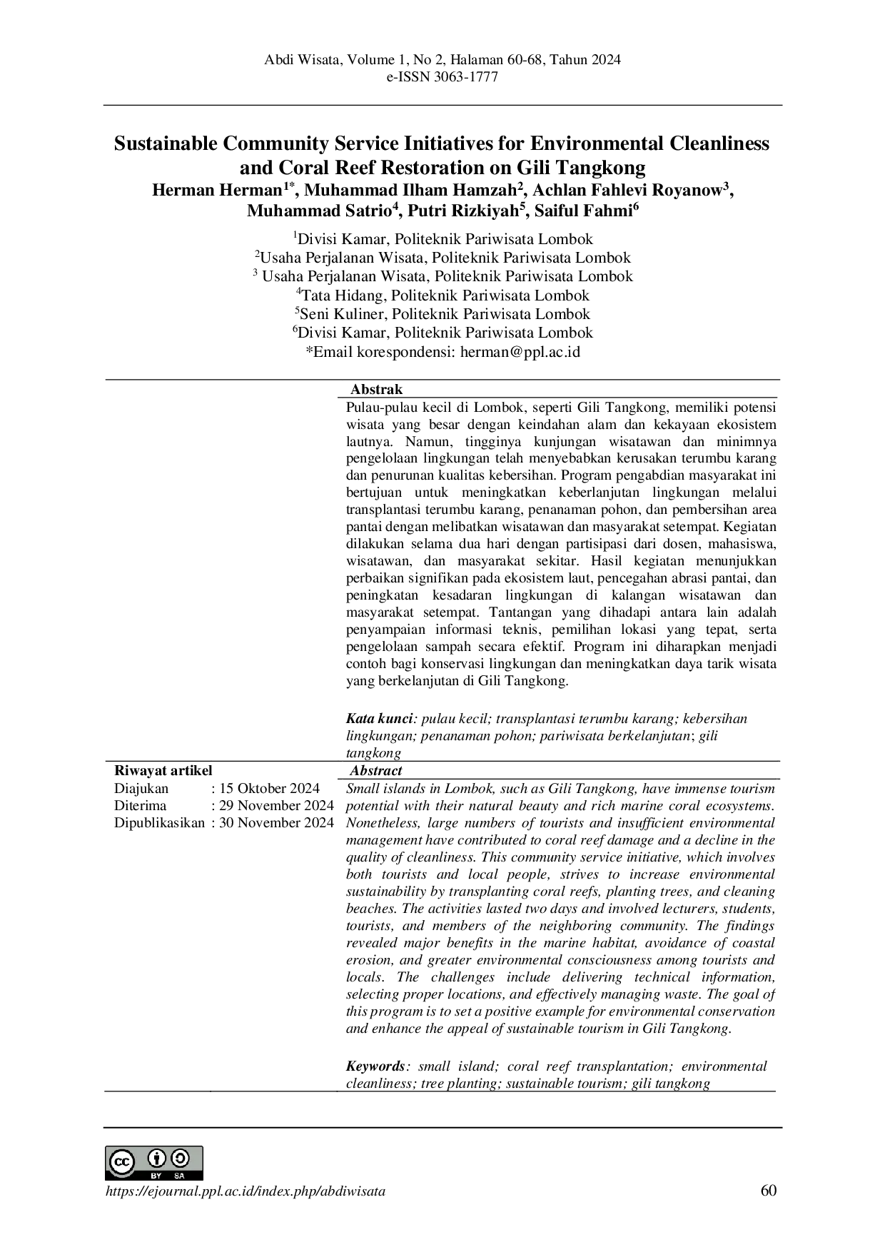 Abdi Wisata: Jurnal Pengabdian Kepada MasyarakatAbdi Wisata: Jurnal Pengabdian Kepada MasyarakatPulau-pulau kecil di Lombok, seperti Gili Tangkong, memiliki potensi wisata yang besar dengan keindahan alam dan kekayaan ekosistem lautnya. Namun, tingginya kunjungan wisatawan dan minimnya pengelolaan lingkungan telah menyebabkan kerusakan terumbu karang dan penurunan kualitas kebersihan. Program pengabdian masyarakat ini bertujuan untuk meningkatkan keberlanjutan melalui transplantasi terumbu karang, penanaman pohon, dan pembersihan area pantai dengan melibatkan wisatawan dan masyarakat setempat. Kegiatan dilakukan selama dua hari dengan partisipasi dari dosen, mahasiswa, wisatawan, dan masyarakat sekitar. Hasil kegiatan menunjukkan perbaikan signifikan pada ekosistem laut, pencegahan abrasi pantai, dan peningkatan kesadaran lingkungan di kalangan wisatawan dan masyarakat setempat. Tantangan yang dihadapi antara lain penyampaian informasi teknis, pemilihan lokasi yang tepat, serta pengelolaan sampah secara efektif. Program ini diharapkan menjadi contoh bagi konservasi lingkungan dan meningkatkan daya tarik wisata yang berkelanjutan di Gili Tangkong.