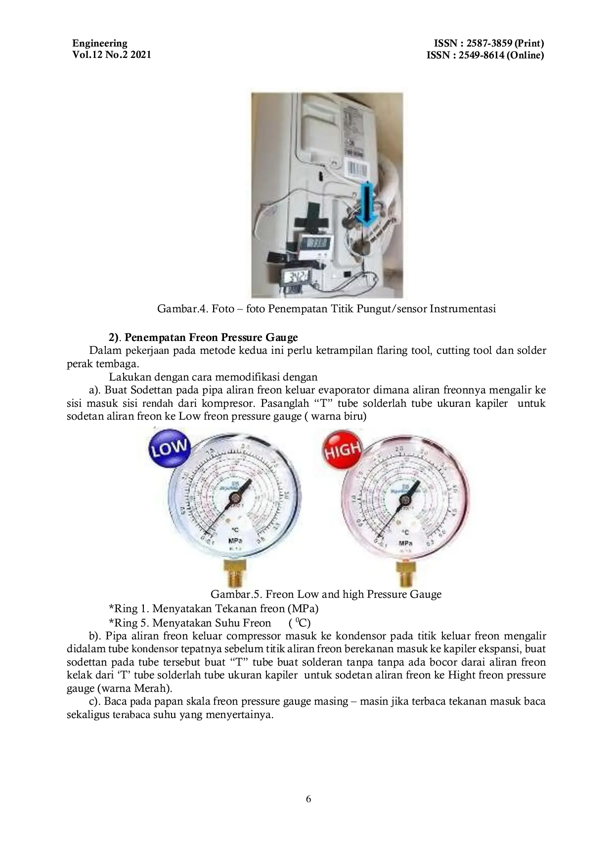 Engineering : Jurnal Bidang TeknikEngineering : Jurnal Bidang TeknikJaringan global pembuatan dari mesin penyejuk udara lebih dikenal dengan sebutan AC dimana penjualan tiap unit mesin tersebut sudah merambah ke setiap ruang residen, perkantoran swasta dan pemerintah terutama negara iklim tropis. Konsep dalam kajian ini disusun suatu metode penulisan praktis berdasarkan analisis ilmiah untuk pengukuran suatu prestasi kerja dari setiap merek AC yang beredar dipasar Nasional, kemudian diambil sampel dari suatu unit instalasi AC dibuat percobaan sederhana dengan tambahan instrument dari thermometer, atau freon pressure gauge, an tabel gas freon Daikin R32 Handling Brochure_EN. Analisis pada kajian ini direncanakan bisa digunakan untuk tujuan panduan praktis, bagi teknisi dan pembelajar, data – data diambil dari hasil pembacaan instrument manual dari pengujian dilakukan dua jam kerja sejumlah kali tiga tiap dua jam pengamatan visual, dari panduan ini jadi dasar pengukuran kinerja unit AC standard bersama rujukan table gas freon R23 properties dengan kalkulasi dari rumusan yang disiapkan, oleh itu terkuak gambaran singkat pengukuran, dan kinerja AC seperti, energi kompresor (Ek), Efisiensi Penggunaan Energy (EER), coeffisient of perfomance (COP), Efisiensi sistim AC (η).