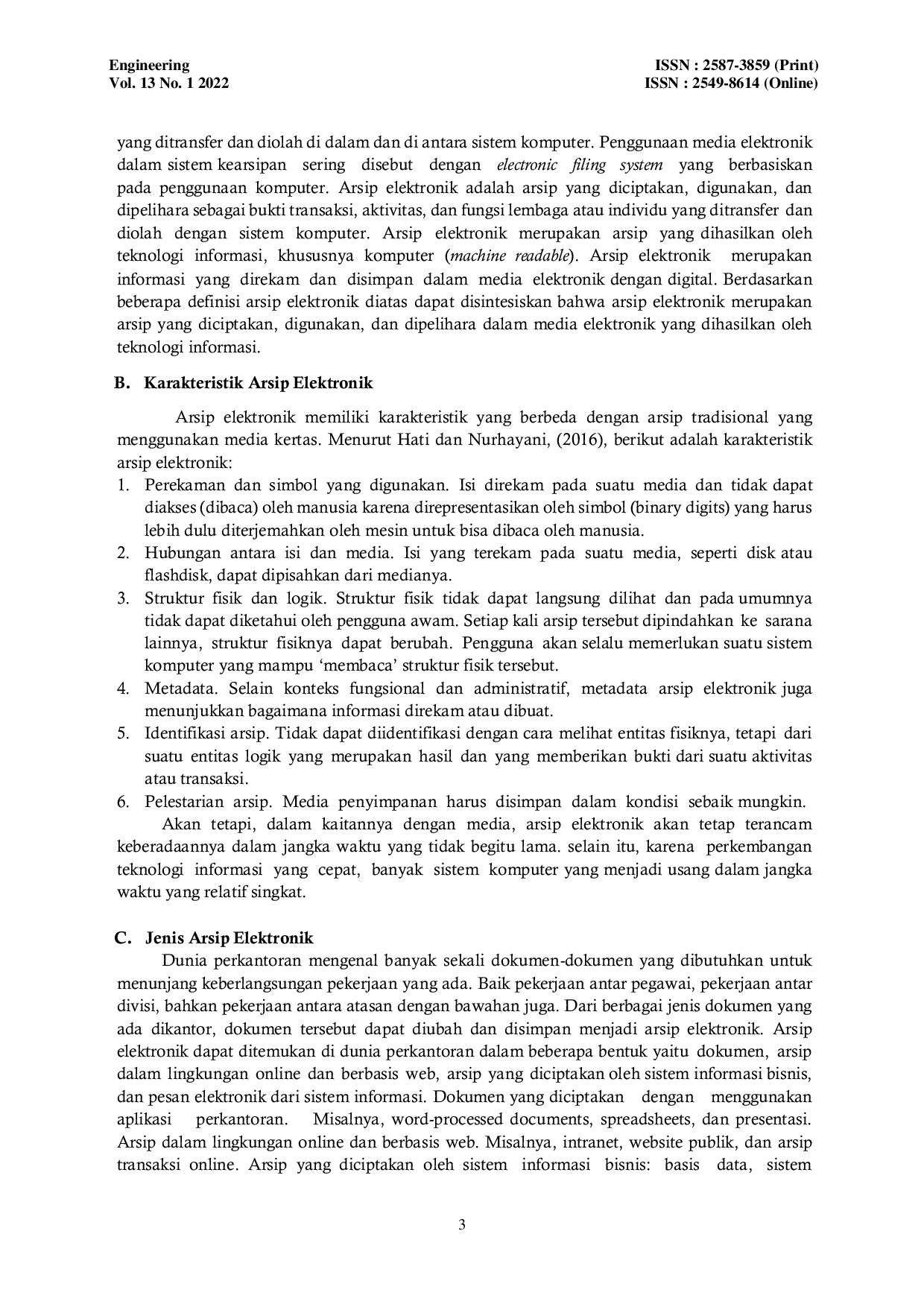 Engineering : Jurnal Bidang TeknikEngineering : Jurnal Bidang TeknikPembuatan sistem informasi E-Arsip pada PT Bank Rakyat Indonesia (Persero) Tbk ini diupayakan untuk kesempurnaan dalam penyelenggaraan kearsipan yang selama ini belum bersifat terpadu, dan seringkali pengelolaan dokumen-dokumen masih dilakukan secara manual, sehingga membuat pekerjaan menjadi tidak efektif dan efisien ketika dihadapkan pada kebutuhan informasi yang cepat. Penerapan arsip elektronik melalui Rail Document System di PT Bank Rakyat Indonesia (persero) tbk meliputi penciptaan dan penyimpanan, penggunaan dan distribusi, pemeliharaan, dan penyusutan. Dalam penciptaan dan penyimpanan meliputi 3 aspek yaitu sortir, scanning, dan media penyimpanan elektronik. Dalam penggunaan dan distribusi meliputi sistem keamanan arsip elektronik. Dalam pemeliharaan meliputi software dan hardware dan dalam proses penyusutan yaitu proses pemindahan arsip elektronik.