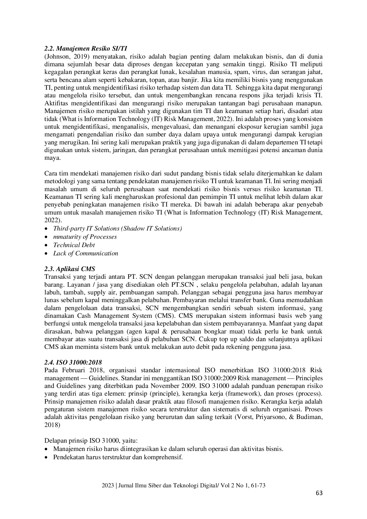 Jurnal Ilmu Siber dan Teknologi DigitalJurnal Ilmu Siber dan Teknologi DigitalTujuan dari penelitian ini adalah untuk membantu PT. SCN dalam meningkatkan kemampuannya dalam manajemen risiko, dengan meminimalkan risiko yang terkandung dalam aplikasi CMS. Selain itu, bertujuan untuk memberikan rekomendasi tindakan risiko untuk risiko yang telah diidentifikasi. Metode penelitian ini menggunakan studi kasus pada PT. Sarana Citranusa Kabil – Batam, yang menggunakan aplikasi Cash Management System (CMS) untuk mendukung kegiatan bisnisnya. Prosedur penelitian mengikuti standar ISO31000:2018. Hasil penelitian menemukan (i) terdapat 20 kemungkinan risiko yang dapat mengganggu kinerja CMS dan kegiatan bisnis; (ii) 2 kemungkinan risiko dengan tingkat tinggi; (iii) 10 kemungkinan risiko dengan tingkat sedang; (iv) 8 kemungkinan risiko dengan tingkat rendah. Penelitian ini berfokus pada manajemen risiko dalam penggunaan aplikasi CMS, tidak membahas risiko di luar keselamatan informasi dan isu lingkungan. Hasil analisis risiko ini adalah rekomendasi tindakan yang diusulkan berdasarkan dampak dan frekuensi kejadian, sehingga PT. SCN dapat mencegah dan meminimalkan risiko agar fungsi aplikasi CMS dapat berjalan optimal.
