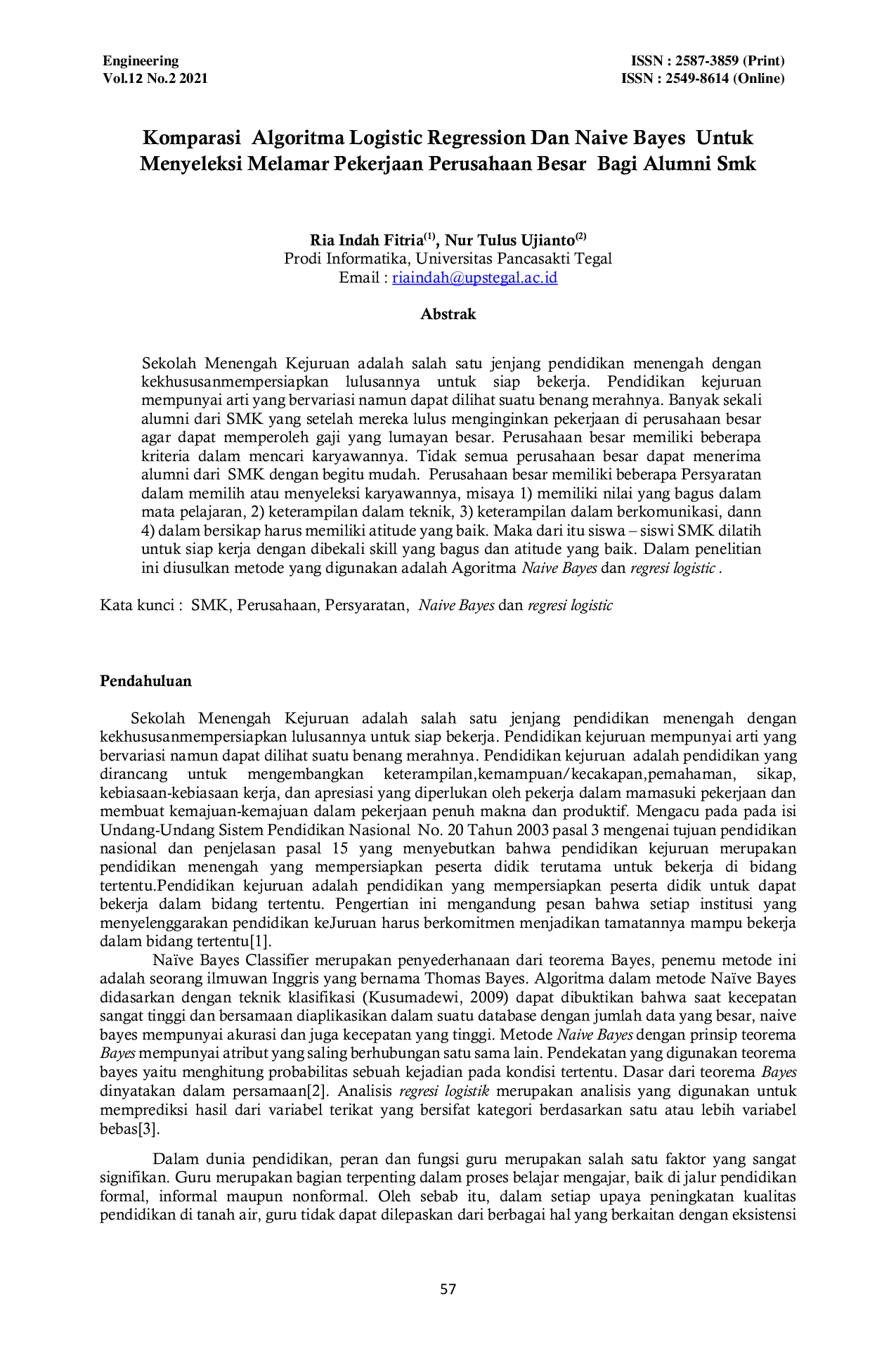 Engineering : Jurnal Bidang TeknikEngineering : Jurnal Bidang TeknikSekolah Menengah Kejuruan adalah salah satu jenjang pendidikan menengah dengan kekhususan mempersiapkan lulusannya untuk siap bekerja. Pendidikan kejuruan mempunyai arti yang bervariasi namun dapat dilihat suatu benang merahnya. Banyak sekali alumni dari SMK yang setelah mereka lulus menginginkan pekerjaan di perusahaan besar agar dapat memperoleh gaji yang lumayan besar. Perusahaan besar memiliki beberapa kriteria dalam mencari karyawannya. Tidak semua perusahaan besar dapat menerima alumni dari SMK dengan begitu mudah. Perusahaan besar memiliki beberapa Persyaratan dalam memilih atau menyeleksi karyawannya, misaya 1) memiliki nilai yang bagus dalam mata pelajaran, 2) keterampilan dalam teknik, 3) keterampilan dalam berkomunikasi, dann 4) dalam bersikap harus memiliki atitude yang baik. Maka dari itu siswa – siswi SMK dilatih untuk siap kerja dengan dibekali skill yang bagus dan atitude yang baik. Dalam penelitian ini diusulkan metode yang digunakan adalah Agoritma Naive Bayes dan regresi logistic.