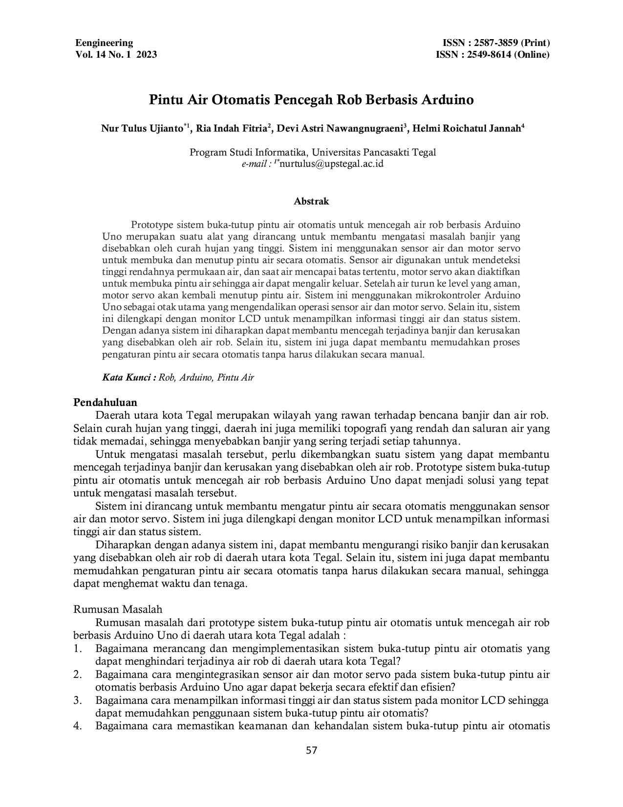 Engineering : Jurnal Bidang TeknikEngineering : Jurnal Bidang TeknikPrototype sistem buka-tutup pintu air otomatis untuk mencegah air rob berbasis Arduino Uno merupakan suatu alat yang dirancang untuk membantu mengatasi masalah banjir yang disebabkan oleh curah hujan yang tinggi. Sistem ini menggunakan sensor air dan motor servo untuk membuka dan menutup pintu air secara otomatis. Sensor air digunakan untuk mendeteksi tinggi rendahnya permukaan air, dan saat air mencapai batas tertentu, motor servo akan diaktifkan untuk membuka pintu air sehingga air dapat mengalir keluar. Setelah air turun ke level yang aman, motor servo akan kembali menutup pintu air. Sistem ini menggunakan mikrokontroler Arduino Uno sebagai otak utama yang mengendalikan operasi sensor air dan motor servo. Selain itu, sistem ini dilengkapi dengan monitor LCD untuk menampilkan informasi tinggi air dan status sistem. Dengan adanya sistem ini diharapkan dapat membantu mencegah terjadinya banjir dan kerusakan yang disebabkan oleh air rob. Selain itu, sistem ini juga dapat membantu memudahkan proses pengaturan pintu air secara otomatis tanpa harus dilakukan secara manual.