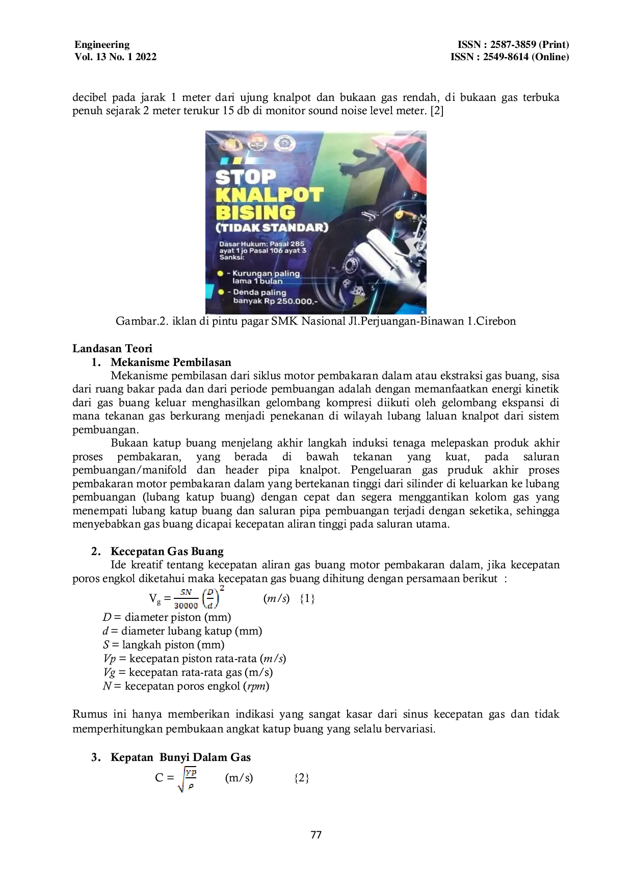 Engineering : Jurnal Bidang TeknikEngineering : Jurnal Bidang TeknikPenyaluran gas buang (Exhaust Muffler) dari Motor Pembakaran Dalam/Internal Combustion Engines, ke lingkungan berproses dari pemasukan campuran fluida gas udara bahan bakar lewati lubang laluan masuk kedalam silinder berlangsung di ruang bakar, disulut pemantik terjadi reaksi pembakaran didalam, produk akhir berupa gas buang panas tekanan tinggi, dikeluarkan lewati lubang laluan keluar ke knalpot merupakan sistem pembuangan penyalur gas buang dari mesin motor dan berakhir dibuang ke lingkungan dampak dari salah satu sumber suara bising.